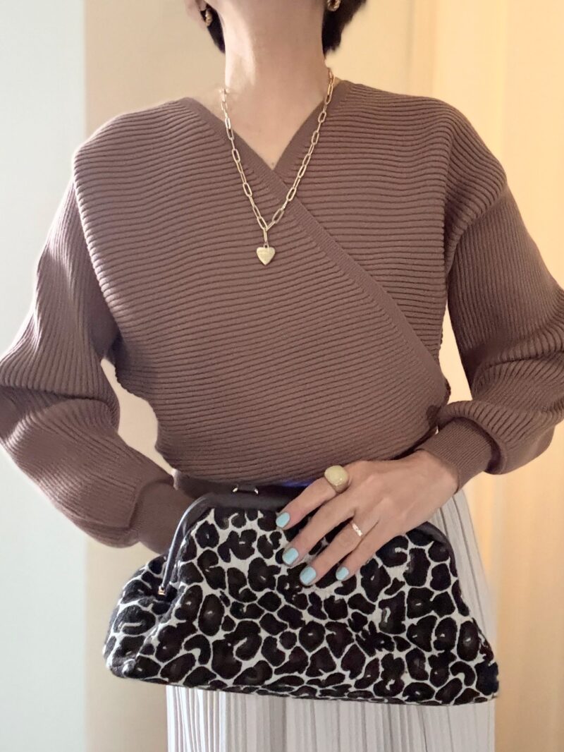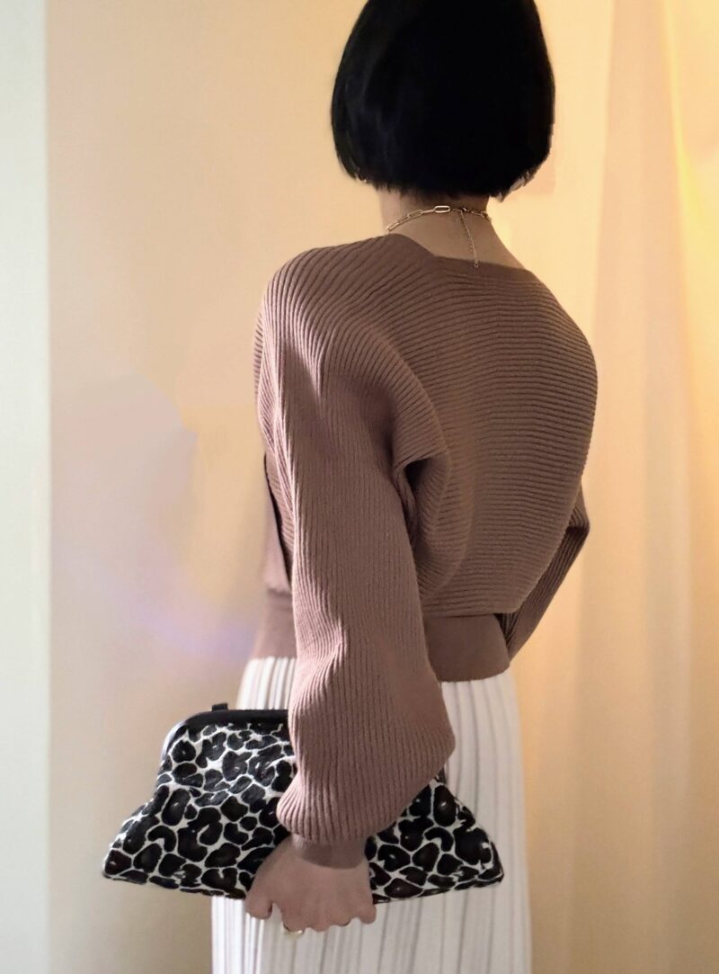 リブニットでカシュクールになっているすごく女らしい雰囲気のニットを発見。セゾンドパピヨンさんのもの。いつもながら「上品な女らしさ」を作りこみたい時に頼りになるshopさん。