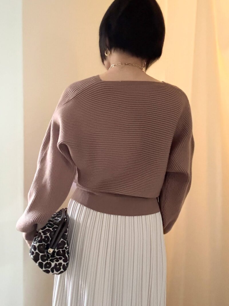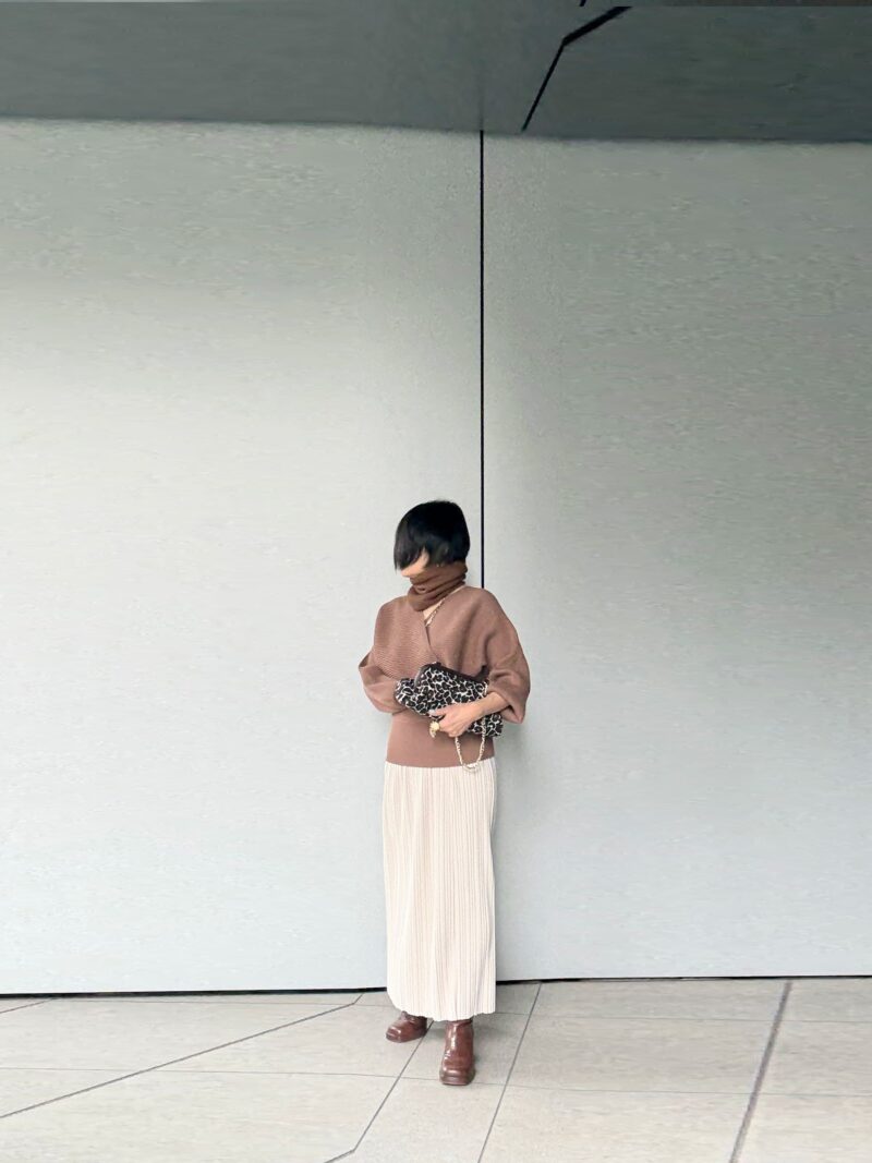 リブニットに合わせてスカートもプリーツ系に。これね、私が半世紀以上生きてきて