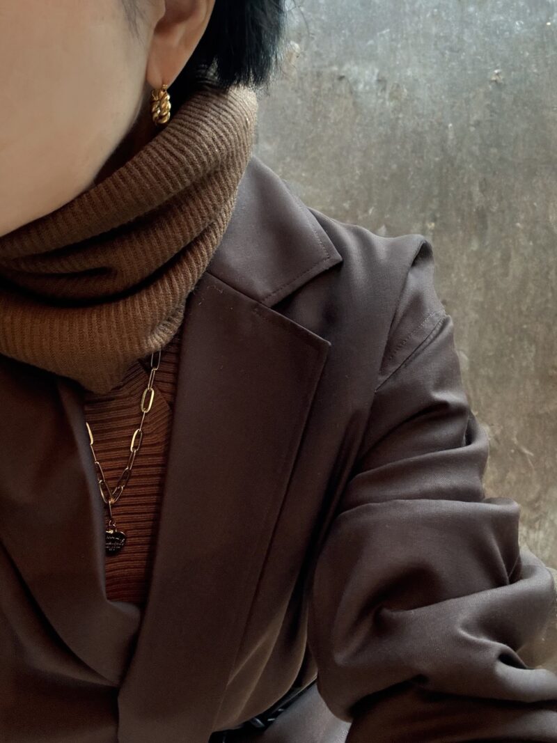 これだけじゃ寒いのでこげ茶のロングコート着る。薄地の軽いもの。