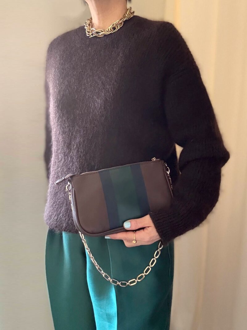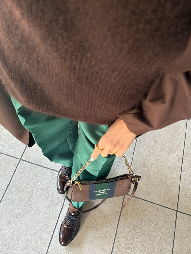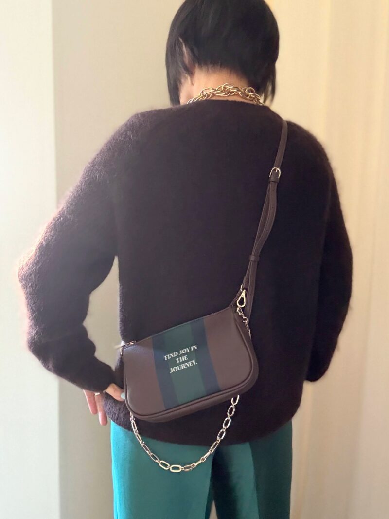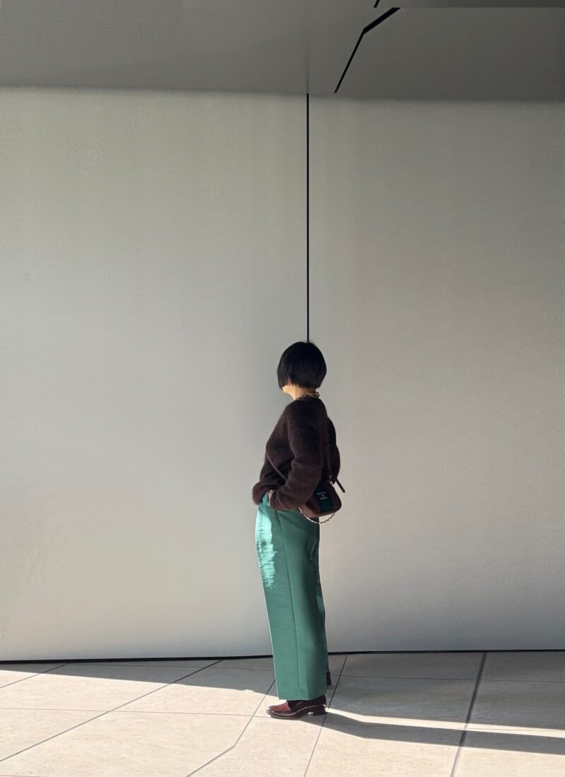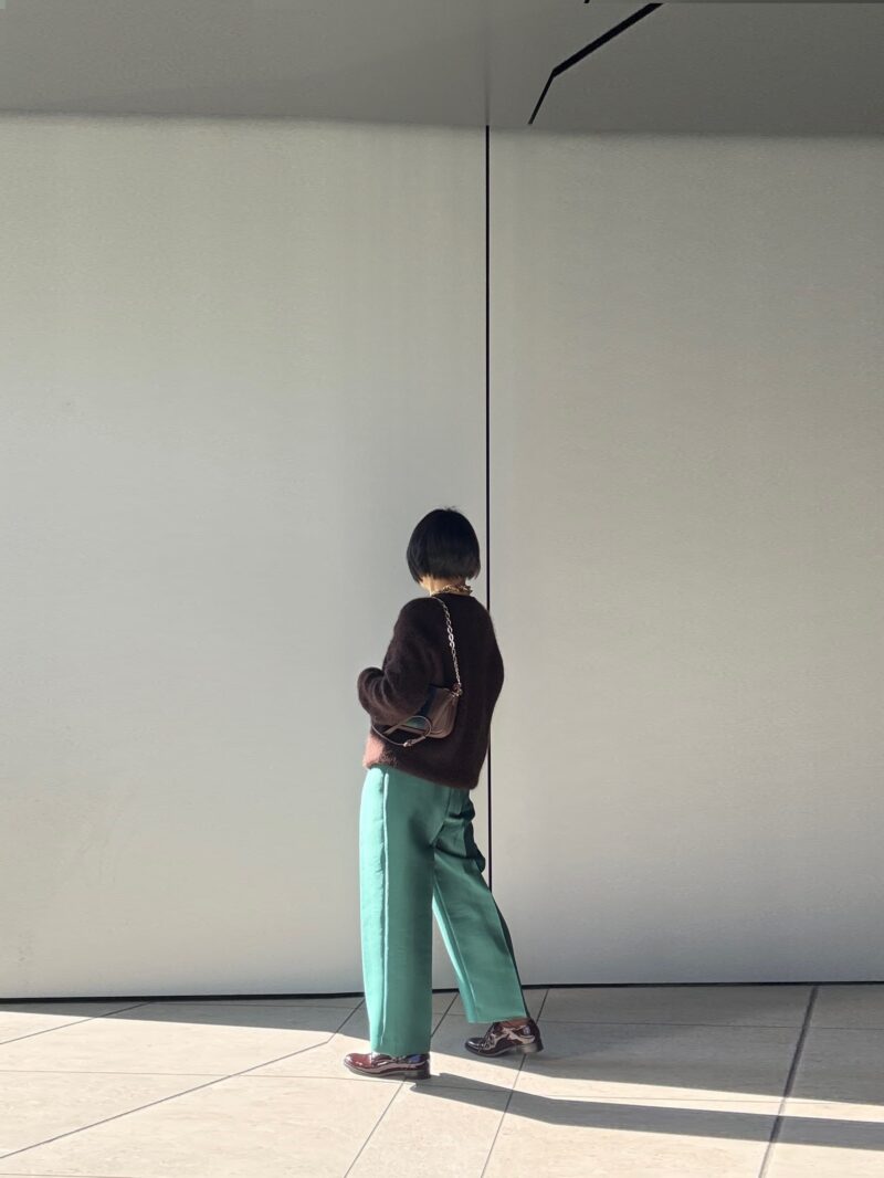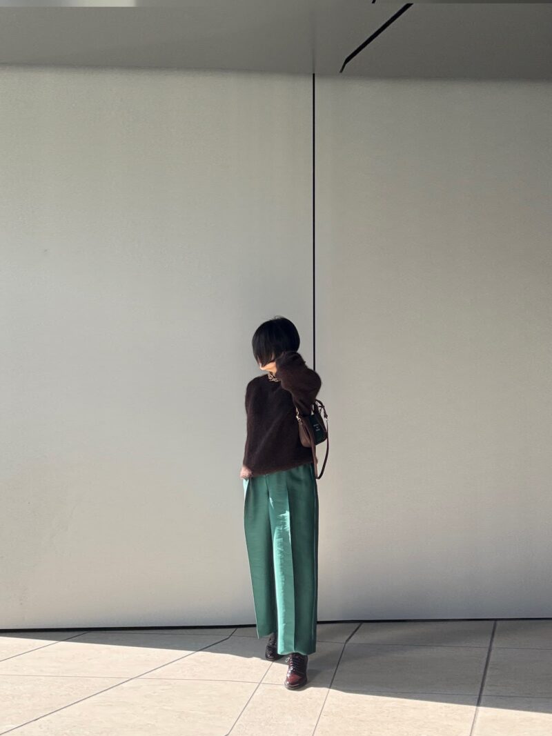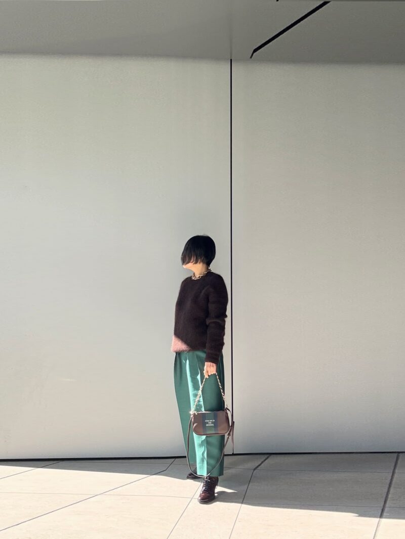 このbagのこげ茶とグリーンの2色を生かして徹底的に「色リンクコーデ」。