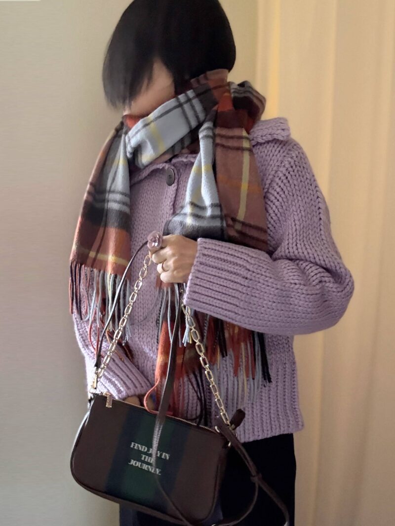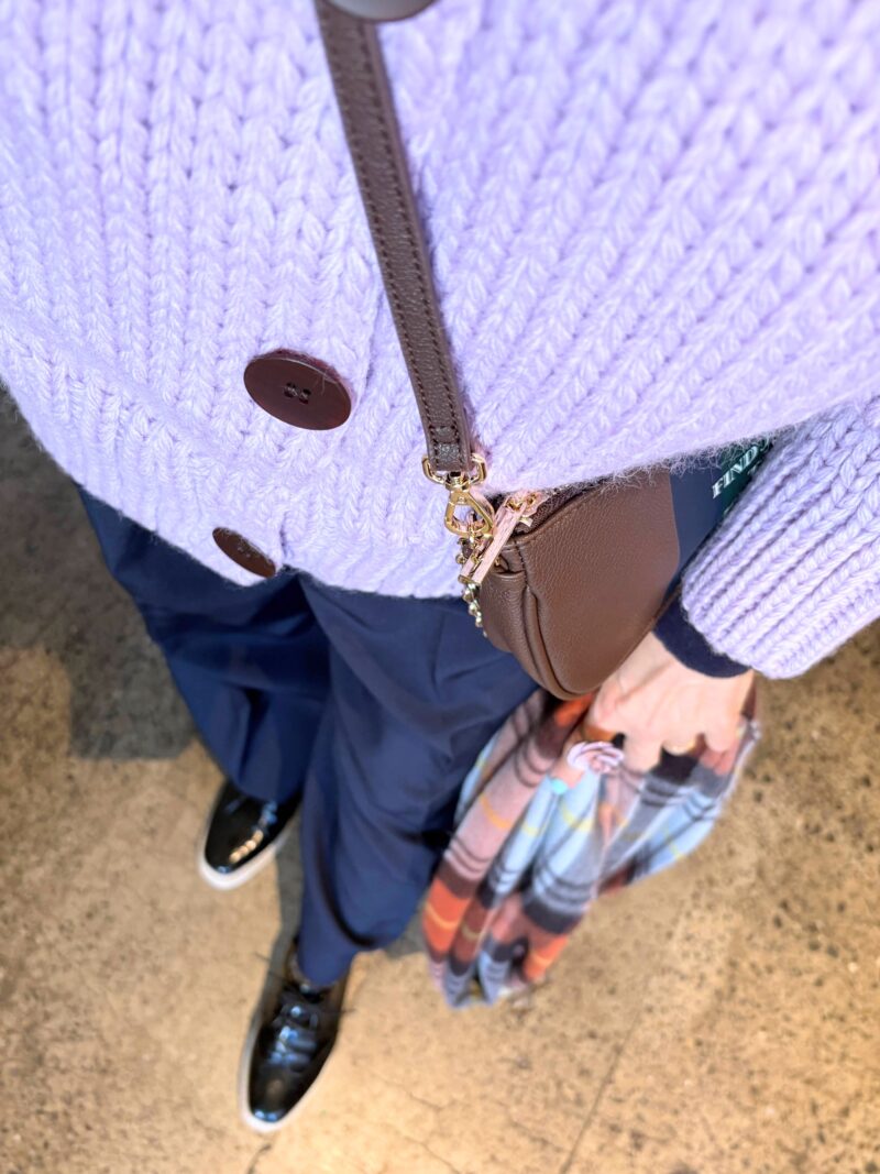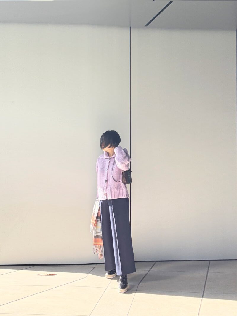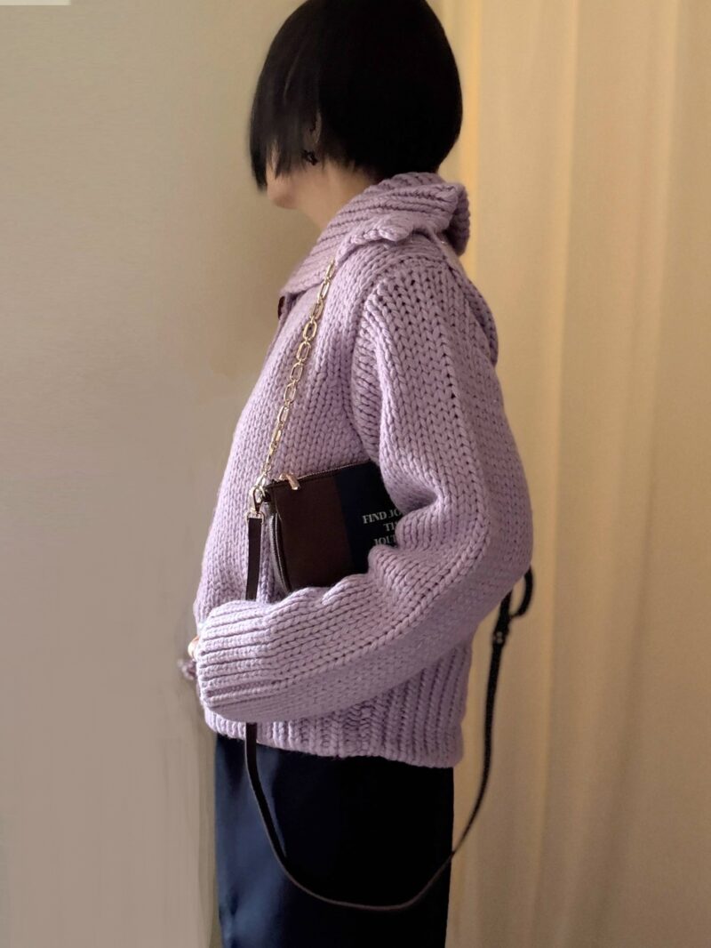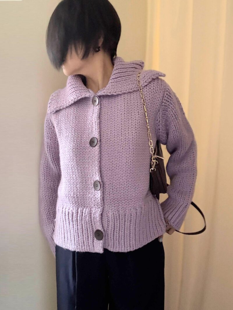 このラベンダー色のニットジャケット、ユナイテッドアローズ ネットストアで見つけたもの。ピンクのニットと一緒に2点買い。