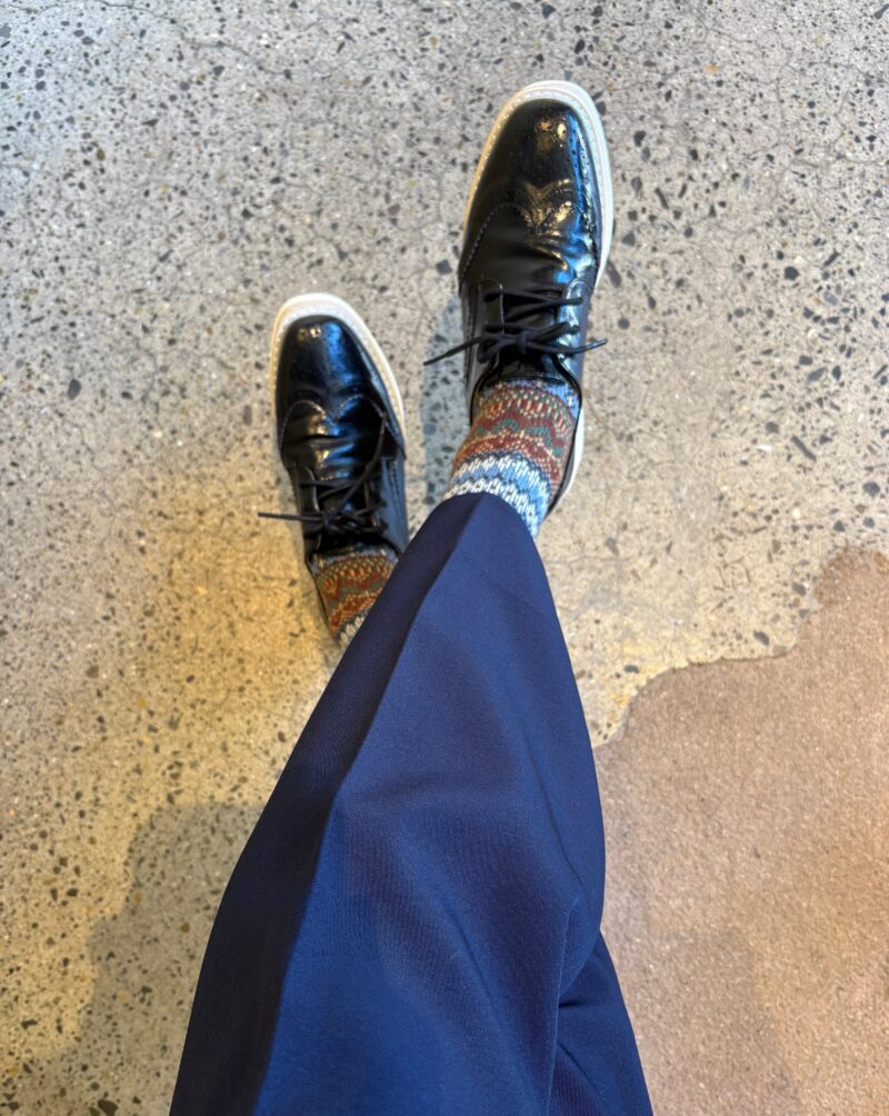 足元。ジュート厚底が歩きやすいレースアップシューズ。おじ靴好きな私のツボ。