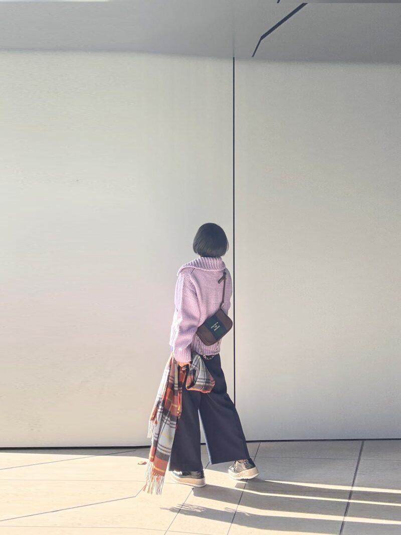 このチェックのカシミアストール、服とどの色もリンクしてないのに何故か調和した・・・。