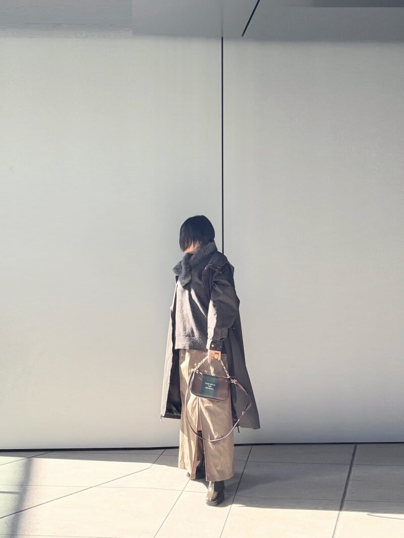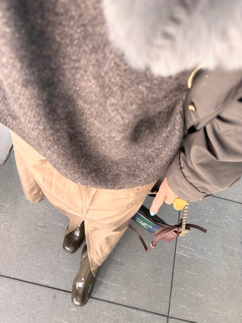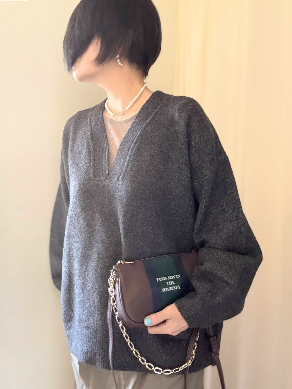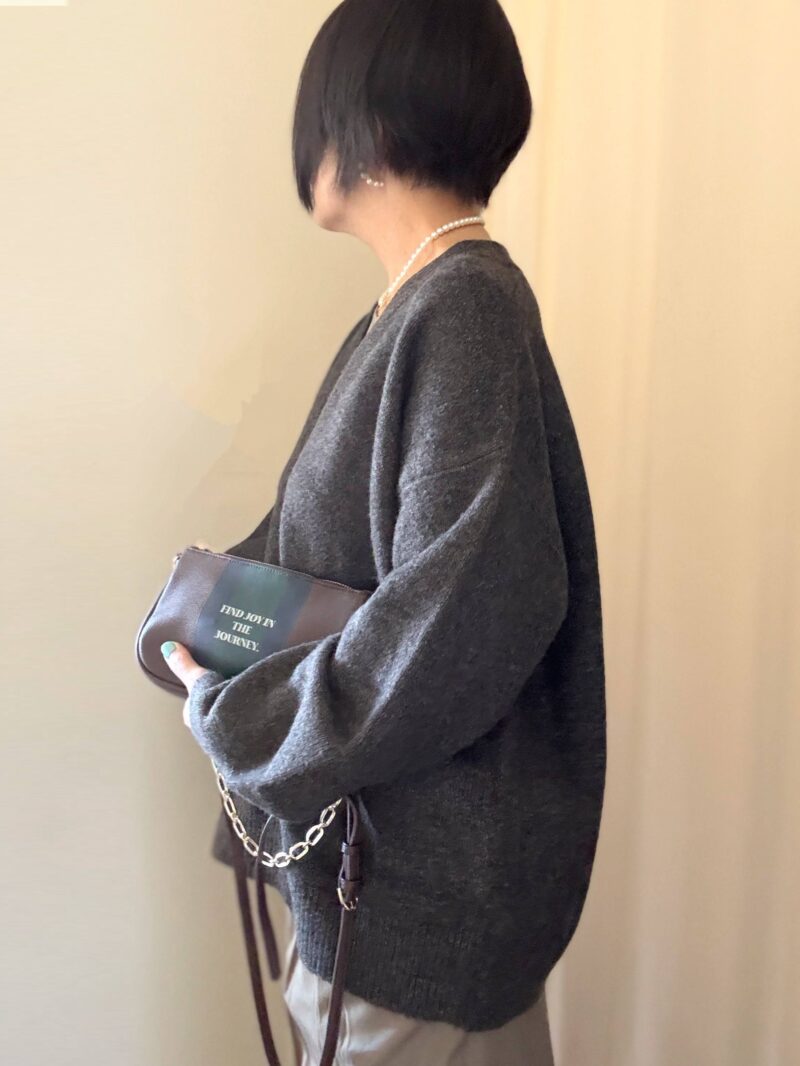 でもこのチャコールが合わせやすいと思うんですよね。黒いコートにも合うし、カーキ色にも合う。グレーのニットにももちろん合う。