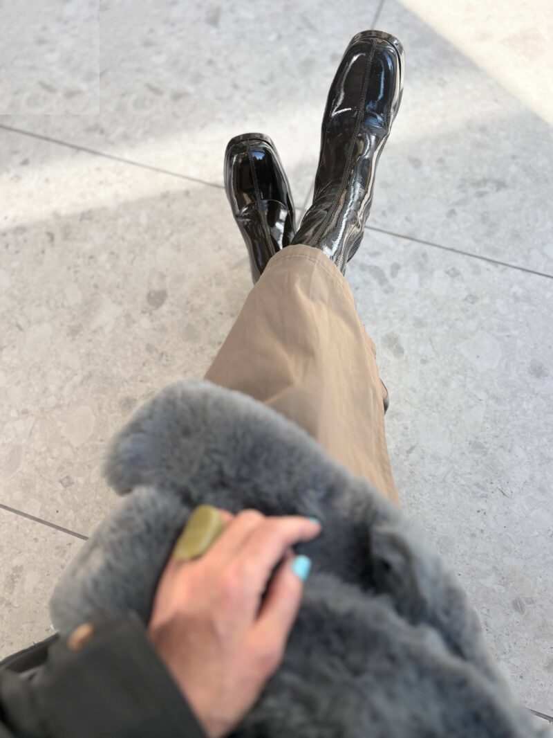 足元。これもオリーブグリーン寄りの濃い色のブーツで。色合わせ。