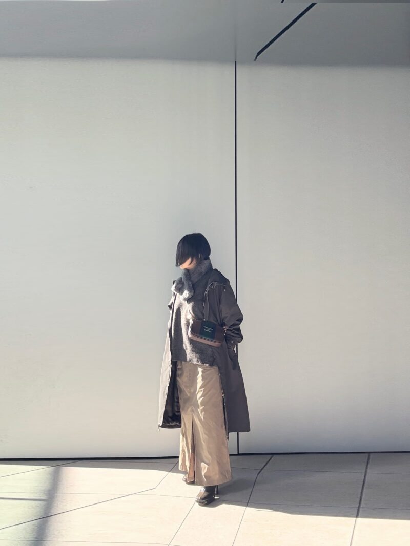 ファーのマフラーの色がコートやニットと合うだけでこんなに馴染み感強いコーデになる!