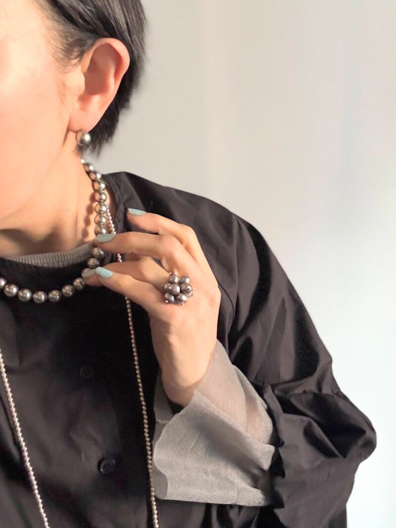 グレーパールはネックレス、ピアス、指輪、一式そろえて持つと無限にコーデが組める。シルバーの粒々ネックレスとの合わせ技もできる。お勧め。