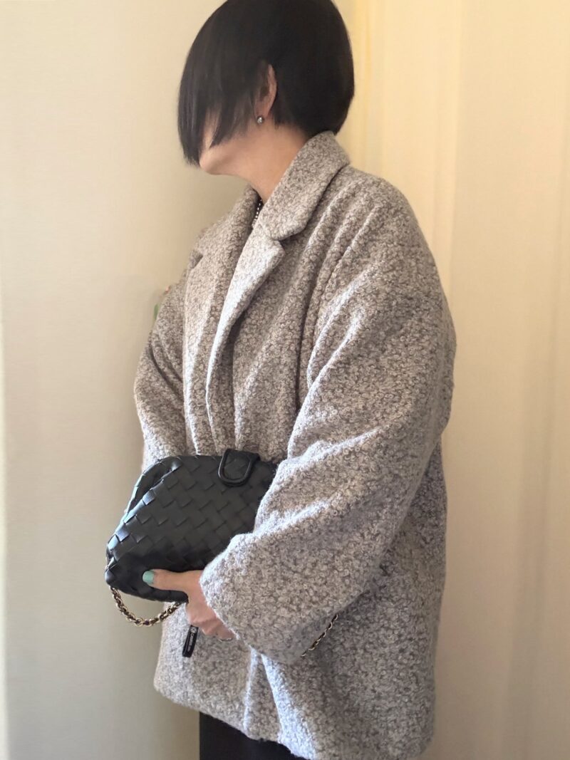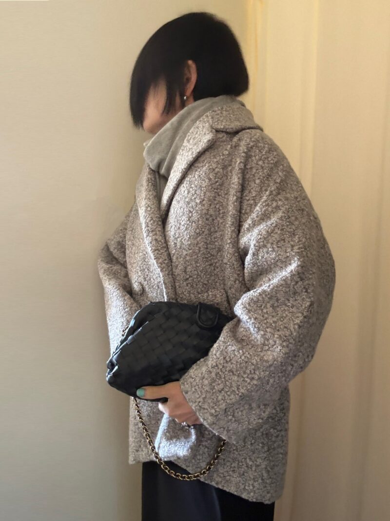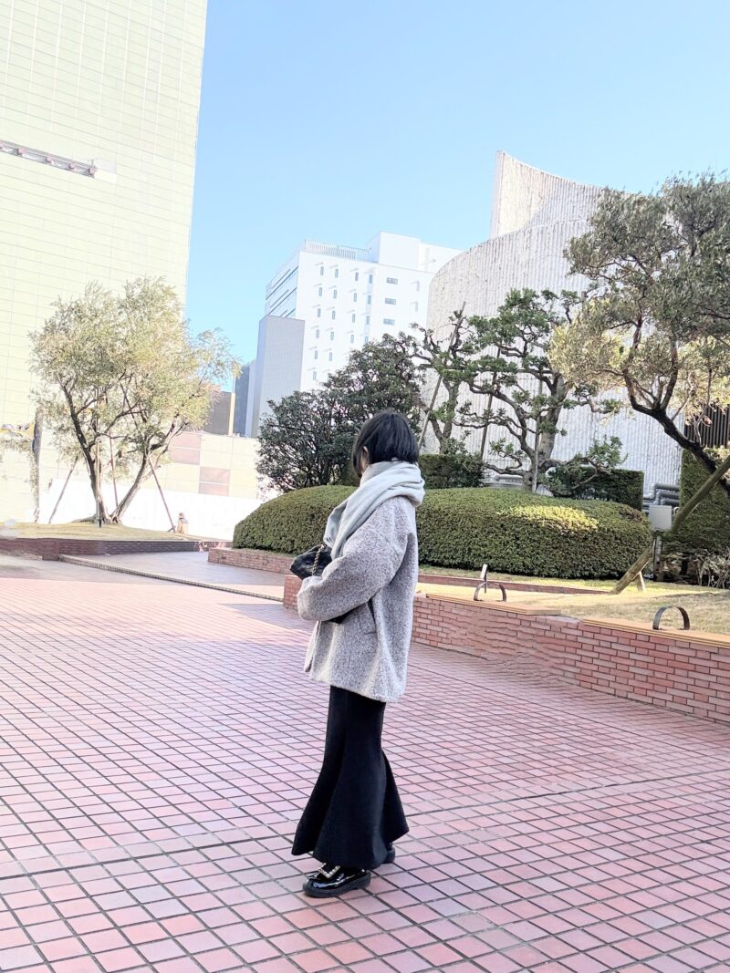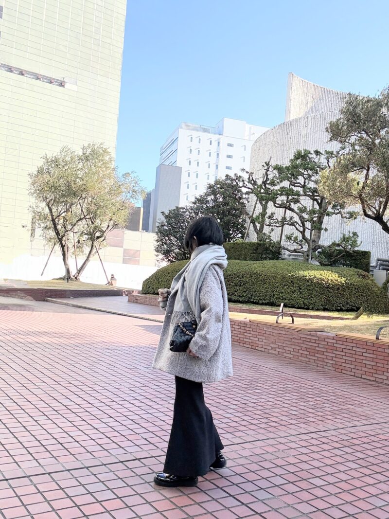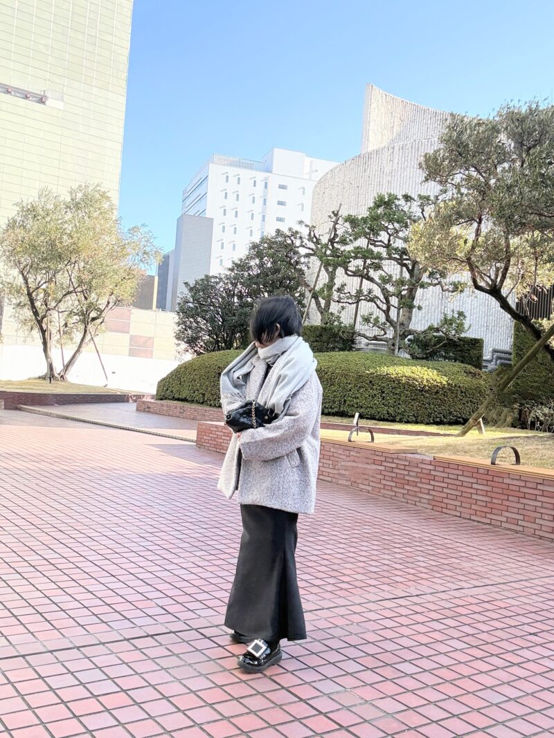 グレーのハーフコート、首元だけ寒かったのでグレーの大判カシミアストール追加。ガッチリ固めると風強くてもヘッチャラ。↑コートの上から巻いてもいいし、巻いてからコート着てもOK。↓。