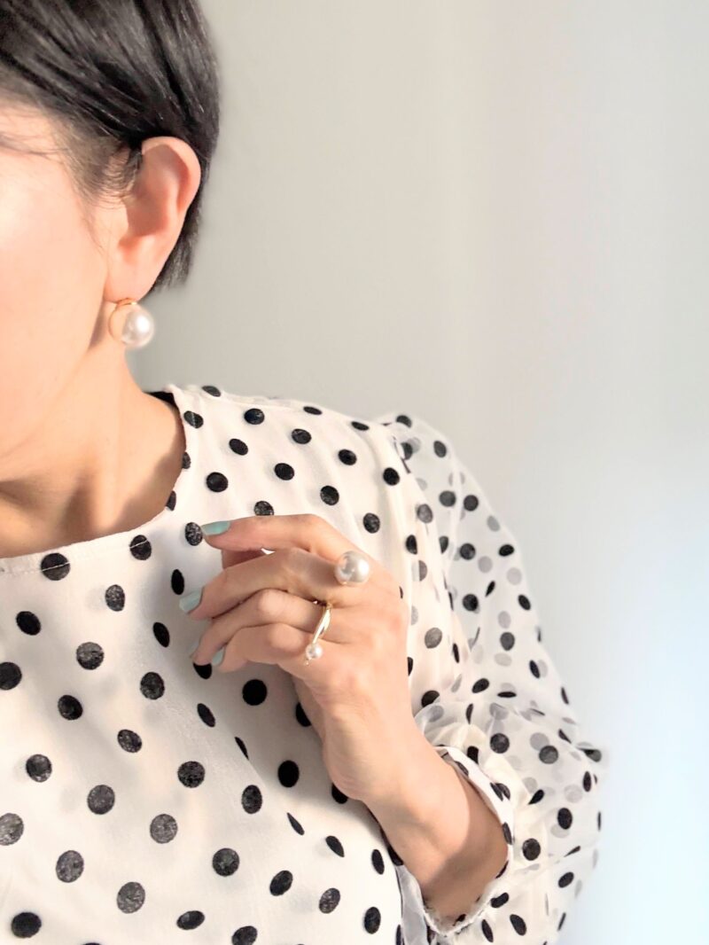 アクセサリー。大きなパールのピアスとダブルフィンガーの指輪。