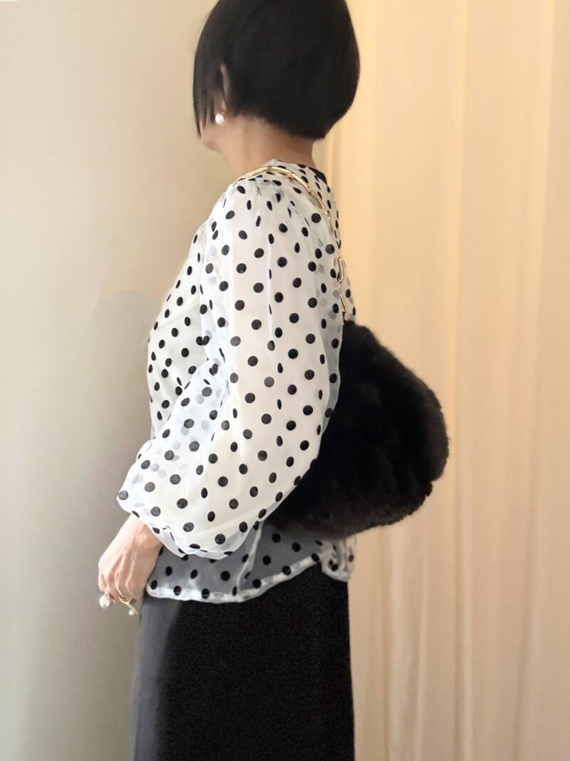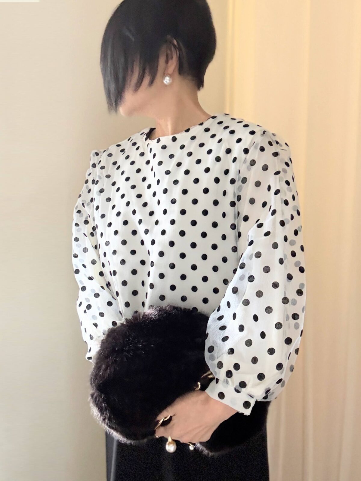 本日水玉。これ、軽くてファスナーもフックも無い。シンプルなプルオーバーのTOPS。シアー感あって着るのが楽しいの。「着て楽しい、気分アガル」というのが最近の服選びで重要ファクタ。