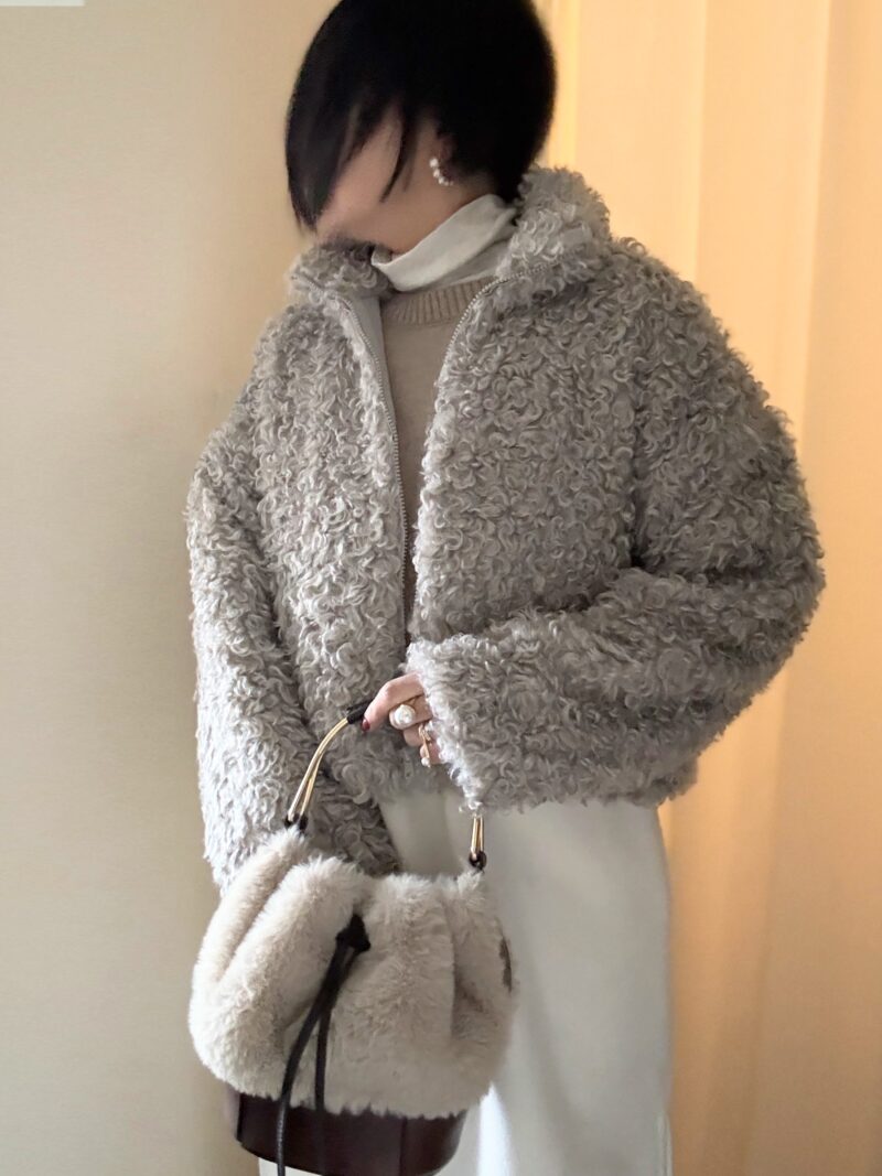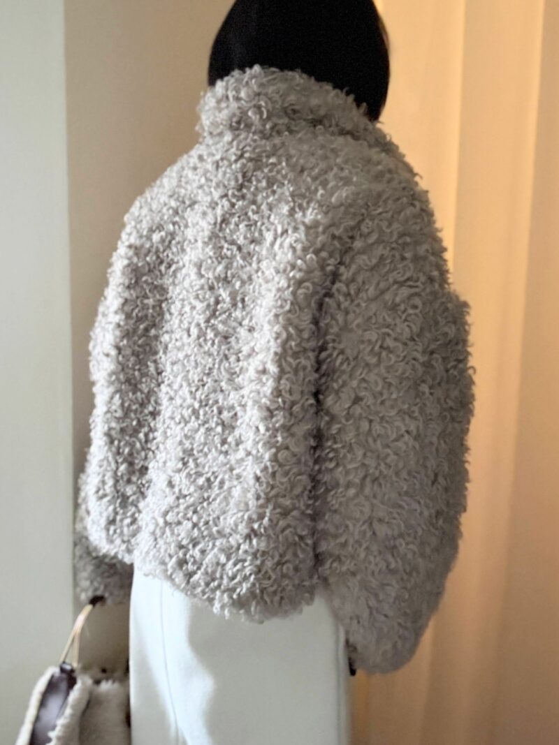 ・カールファーのコート:プードルファーショートコート 色:グレージュ