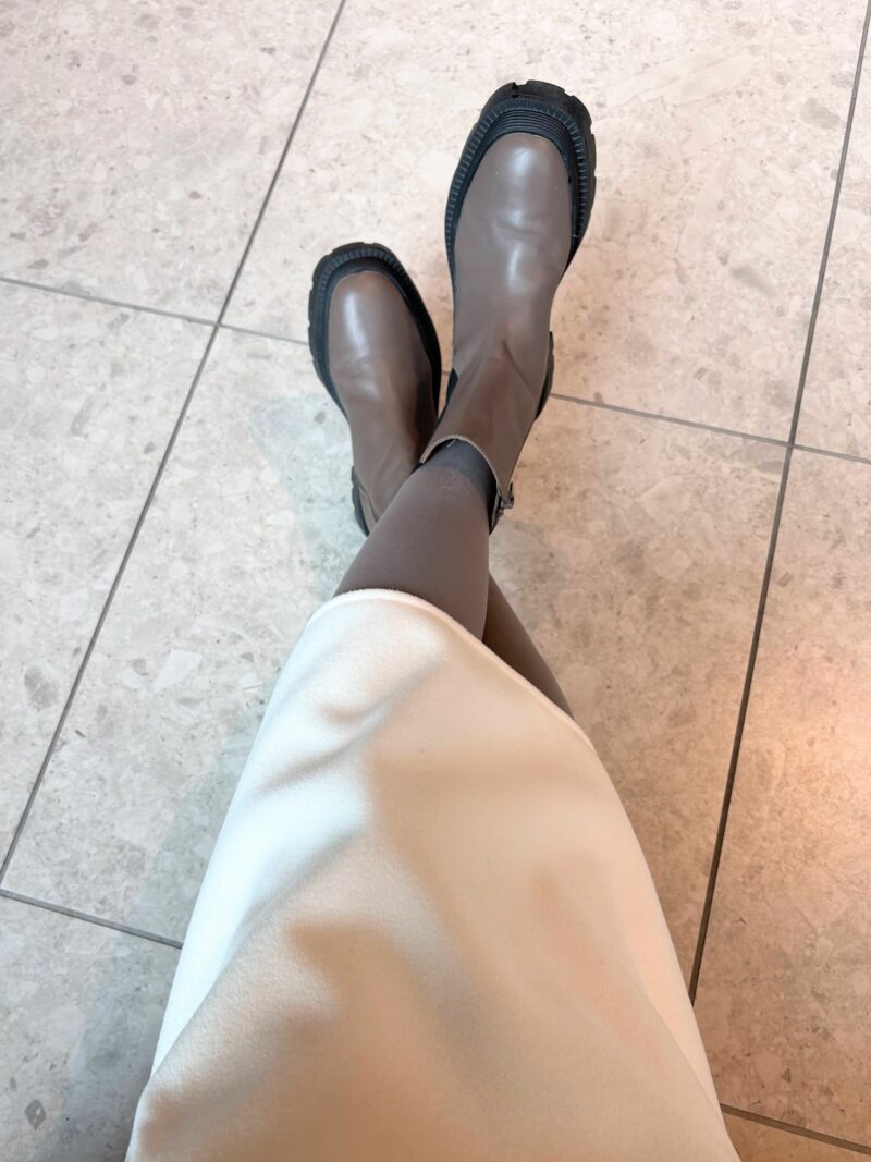 足元。色合わせしてグレージュ色のサイドゴアブーツで。タイツの色がピッタリやないかい!!さすがTabio。