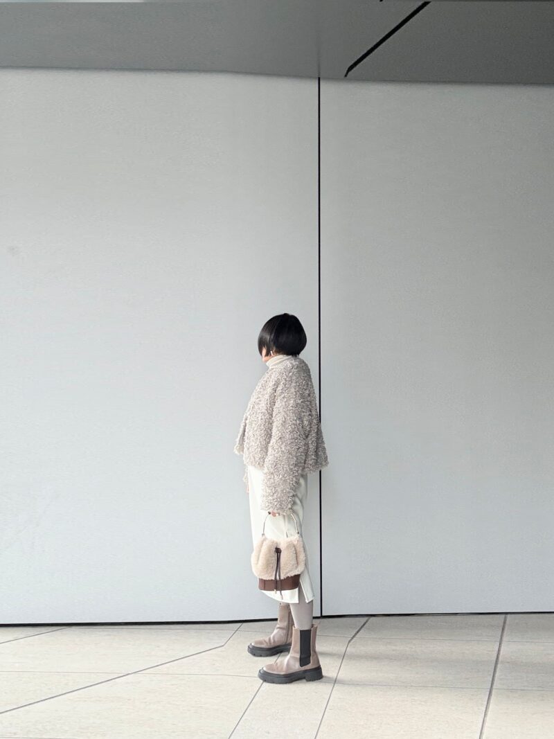 白のジャンスカ、もうちょい丈が長いといいんだけど。ここはミドルブーツで繋げるしかない。