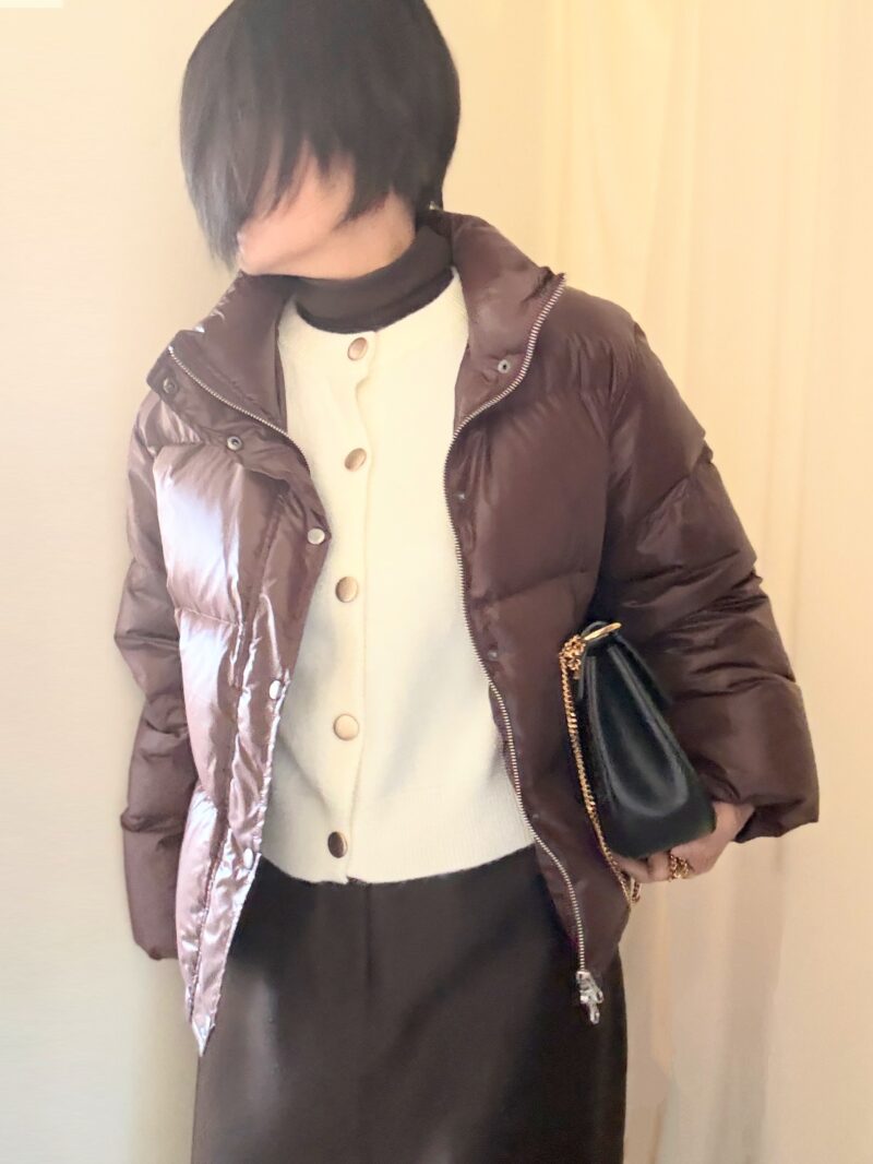 こげ茶コーデだけど、TOPSは白にしてメリハリを。金ボタンのニットカーディガンの下にこげ茶タートルネックの暖かいカットソー。暖かいのでこればっかり・・・