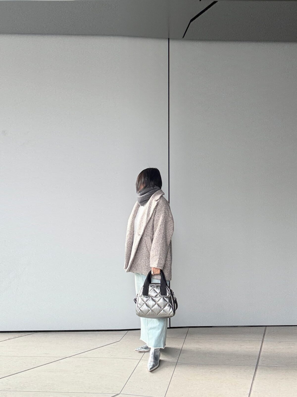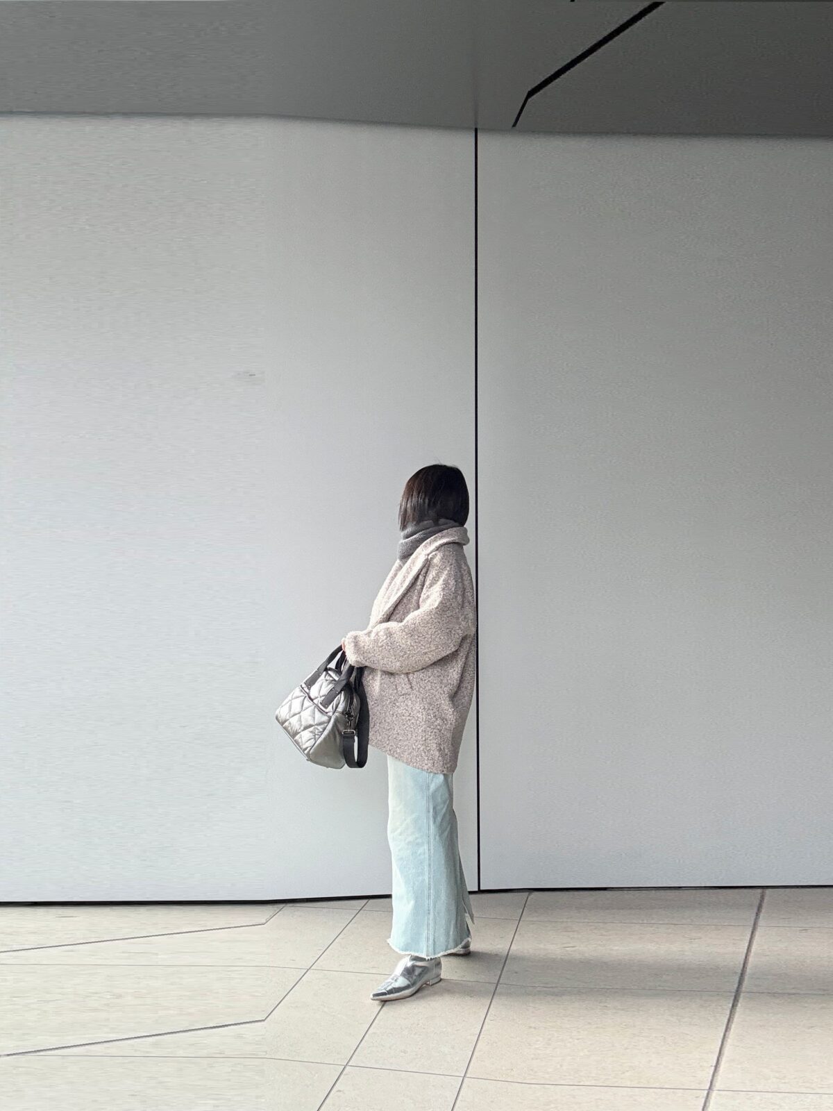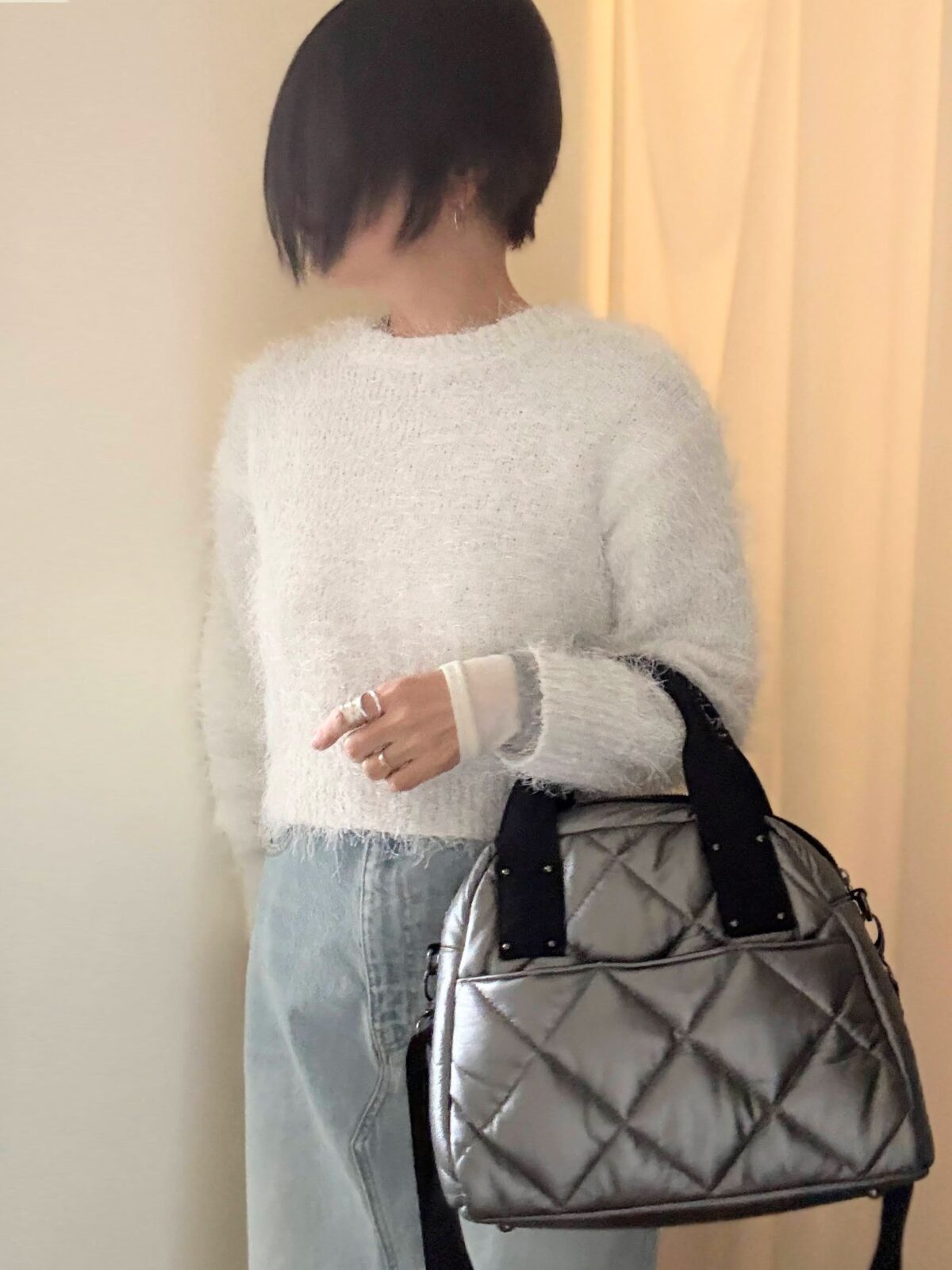 溺愛HAYNIのシルバーのキルティングbagは今日みたいにグレー系のコーデの時にピッタリ。デニムのカジュアル味にも馴染む。軽くて滑りの良いストラップは斜め掛けしても食い込まず。。。楽!