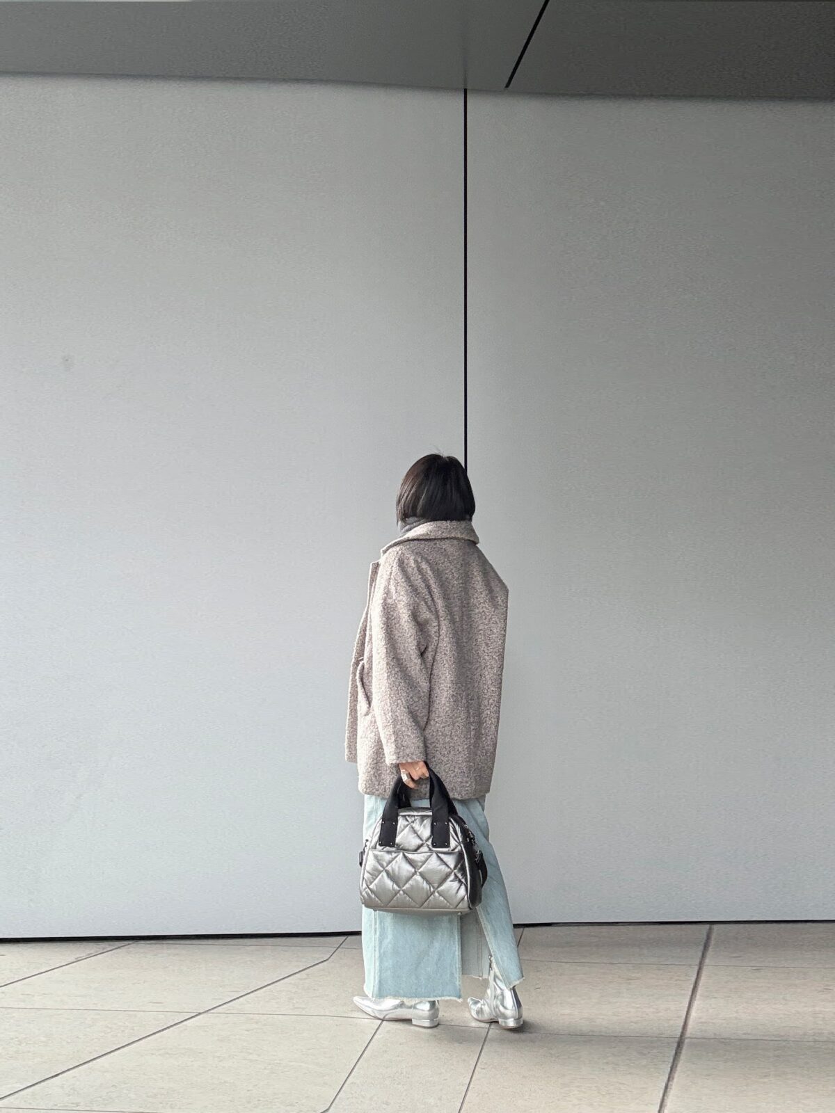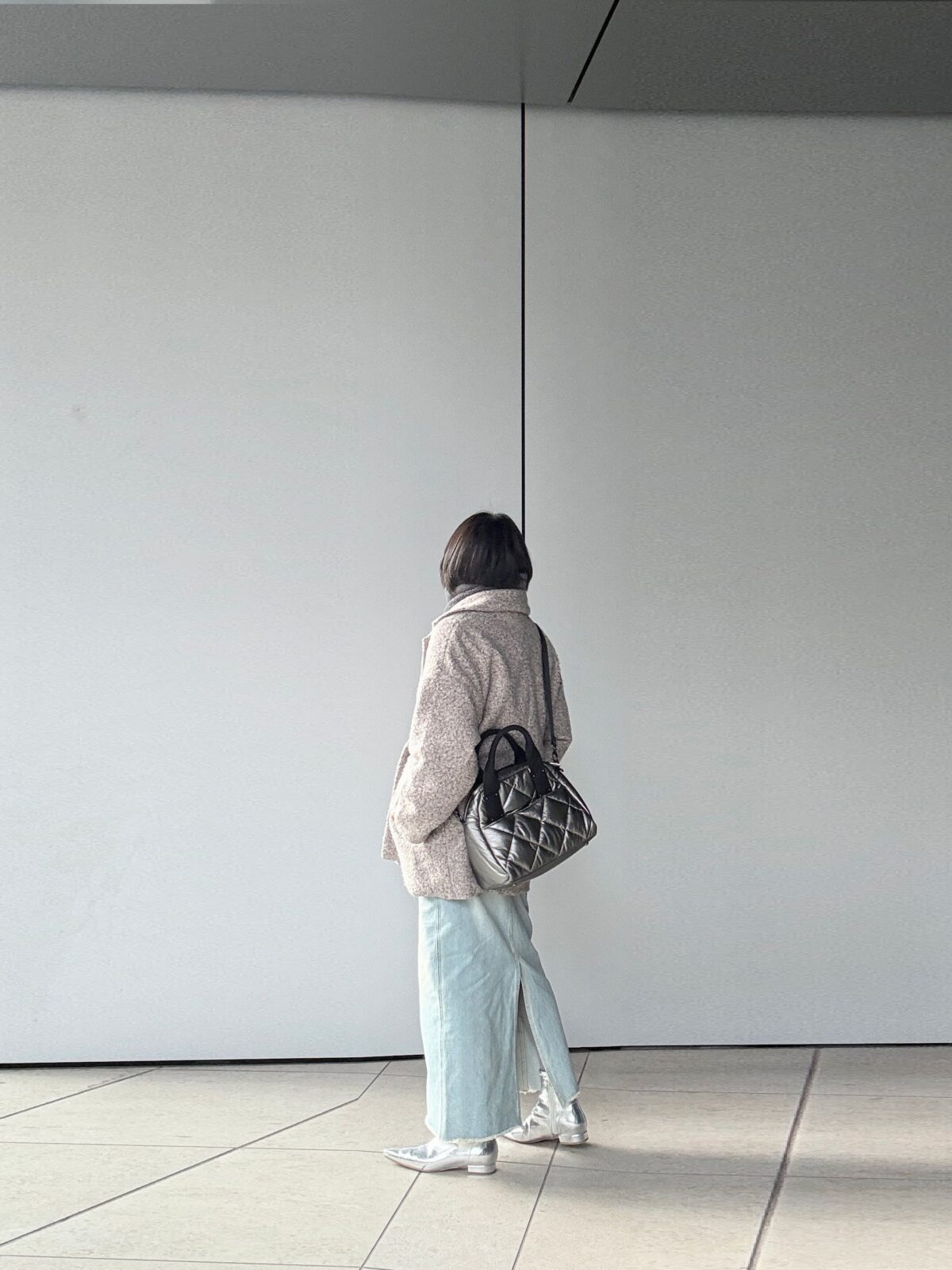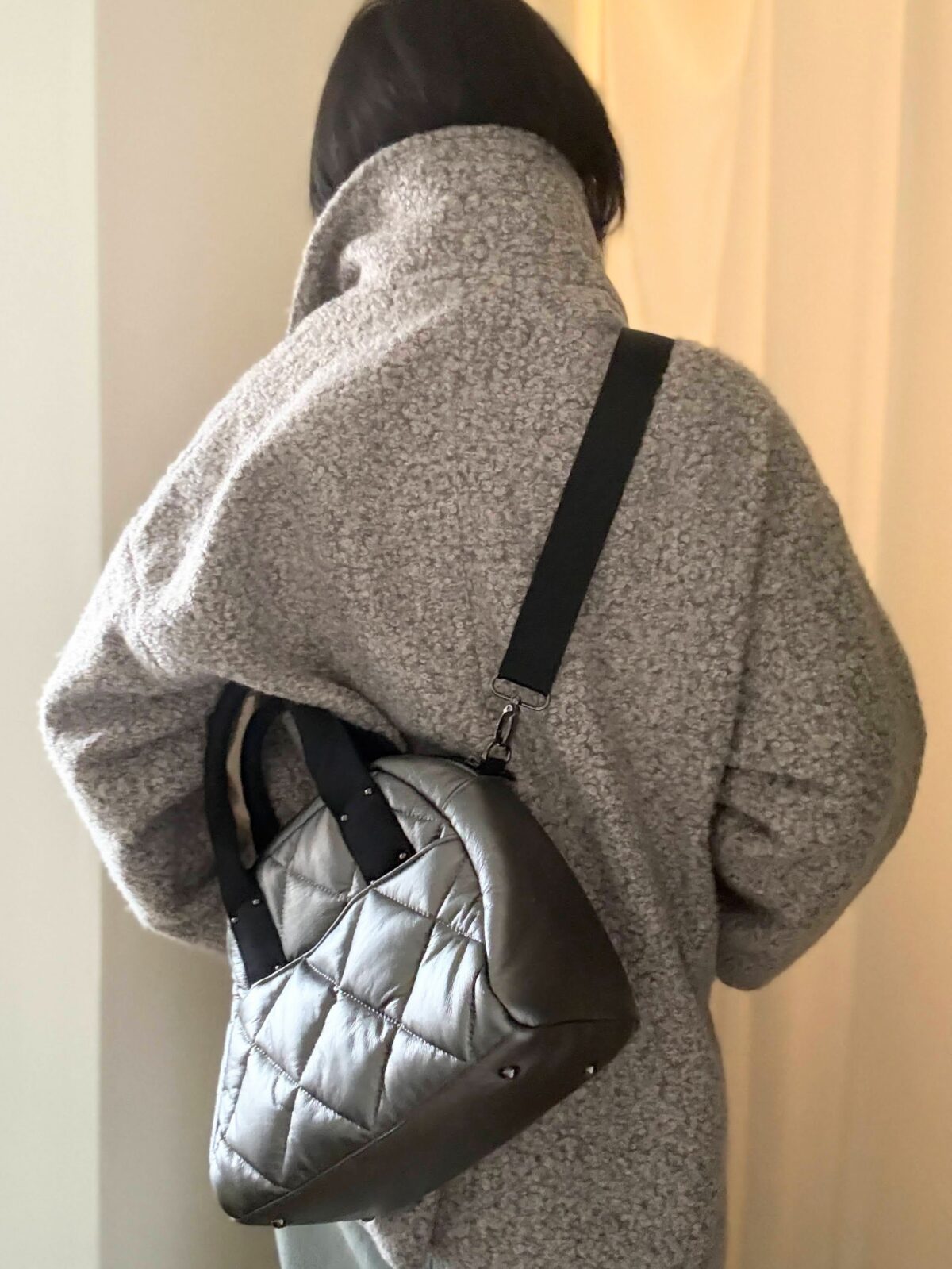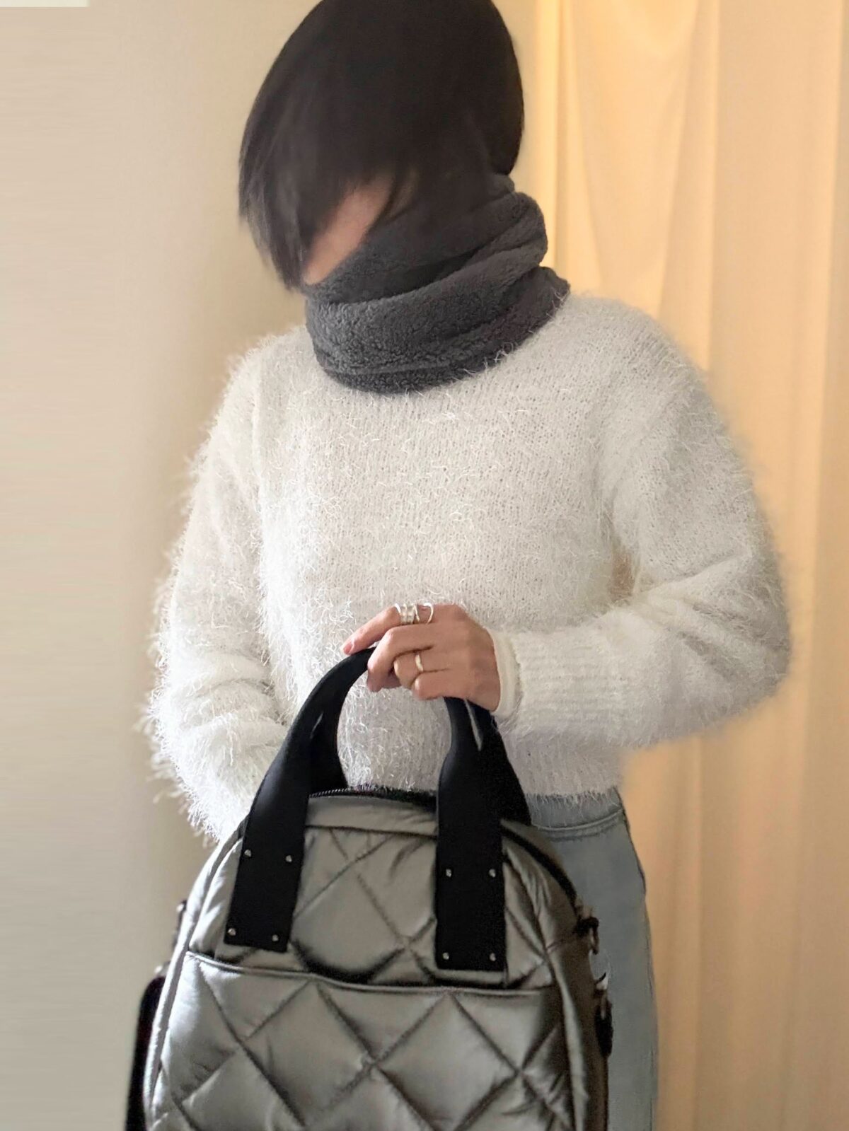 溺愛HAYNIのシルバーのキルティングbagは今日みたいにグレー系のコーデの時にピッタリ。デニムのカジュアル味にも馴染む。軽くて滑りの良いストラップは斜め掛けしても食い込まず。。。楽!