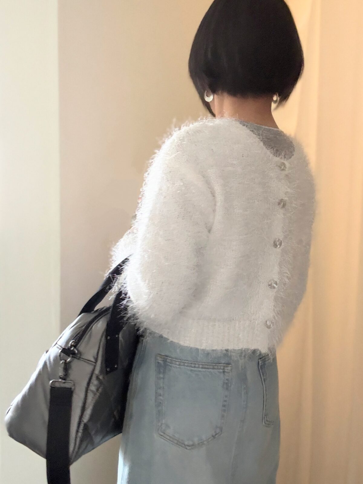 今日のコーデはグレーのシアーニットにシャギーなショートカーディガンニット+デニムスカート。