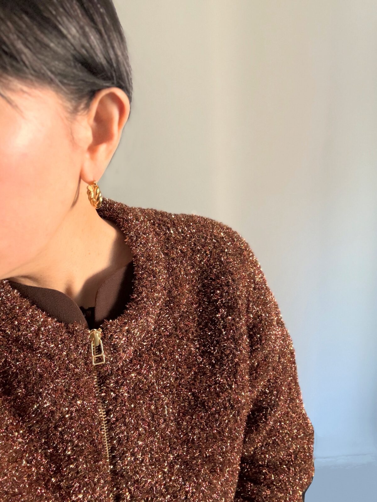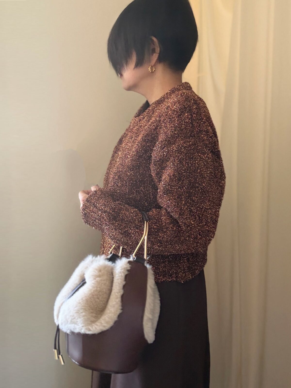 すごいラメ感あって輝いているの。これ一枚で華やかさが爆誕。よってアクセサリーはGOLDのピアスのみとした。