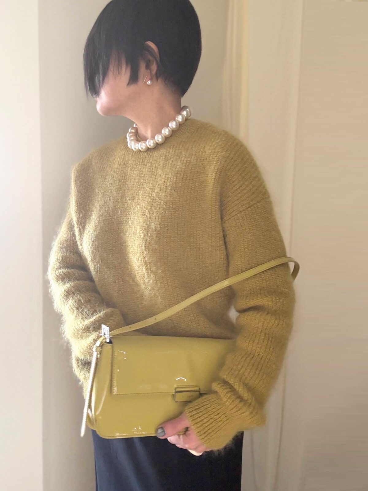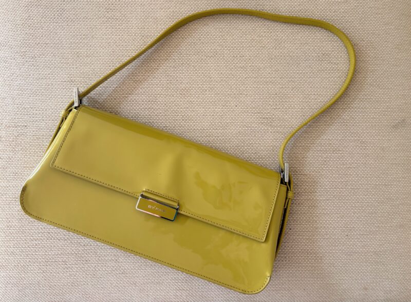 確かに。「ヴィンテージっぽいbagだな~」と思ったのだけど、言われて見ると90年代ぽい。形も横長でクラッチ持ち出来そう。パテント素材の本革の質感が◎。