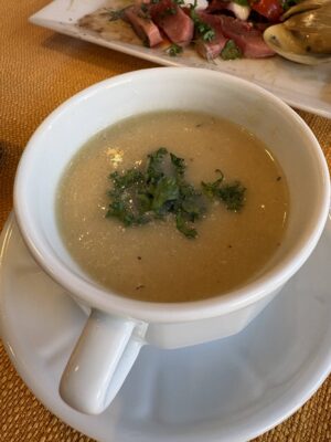 助かる。編み物談義しながら家ランチ。折りたたまないガレット(そば粉クレープ)、白菜のポタージュ、シーフードマリネなど。