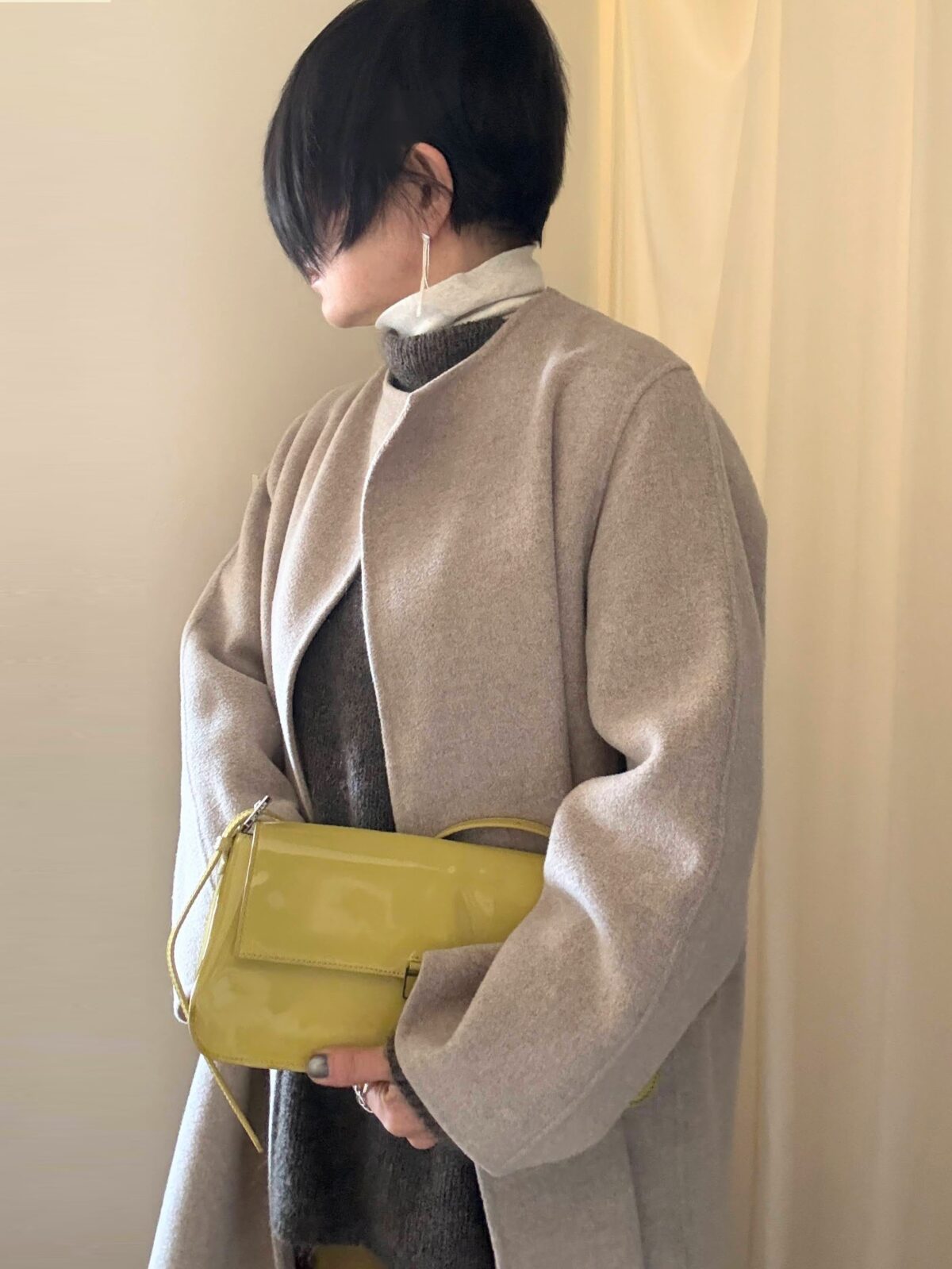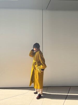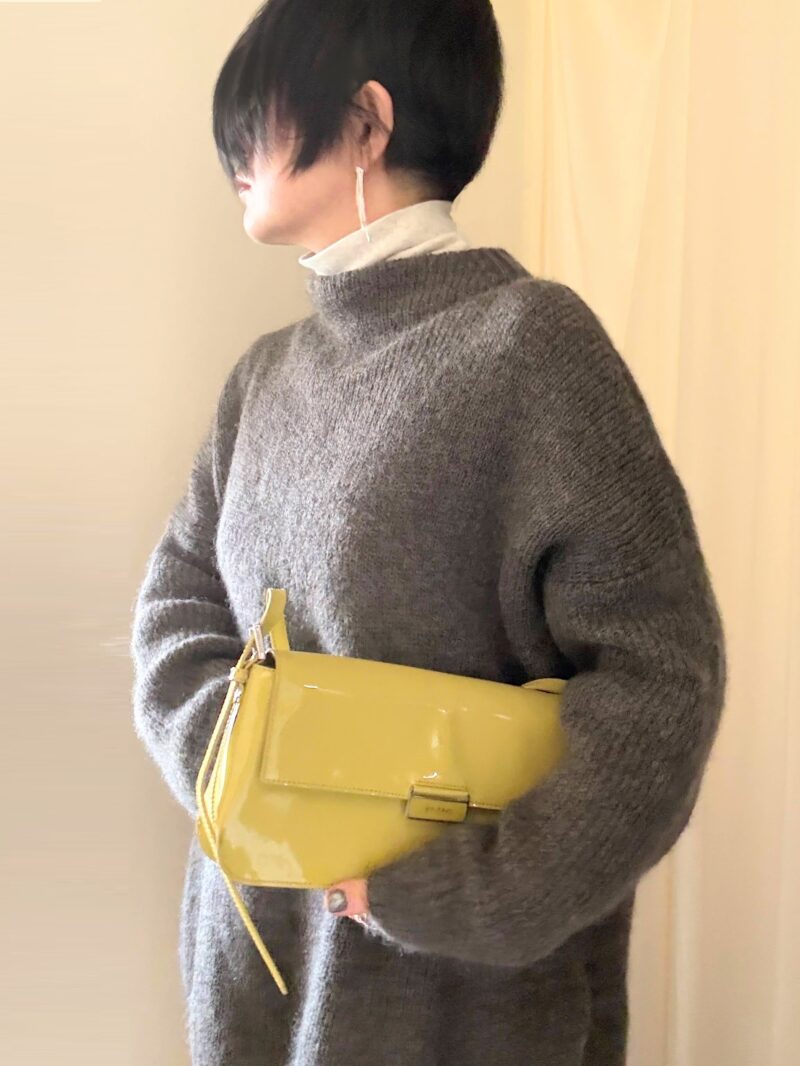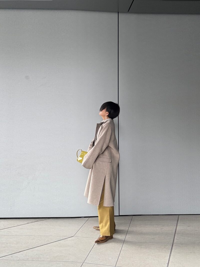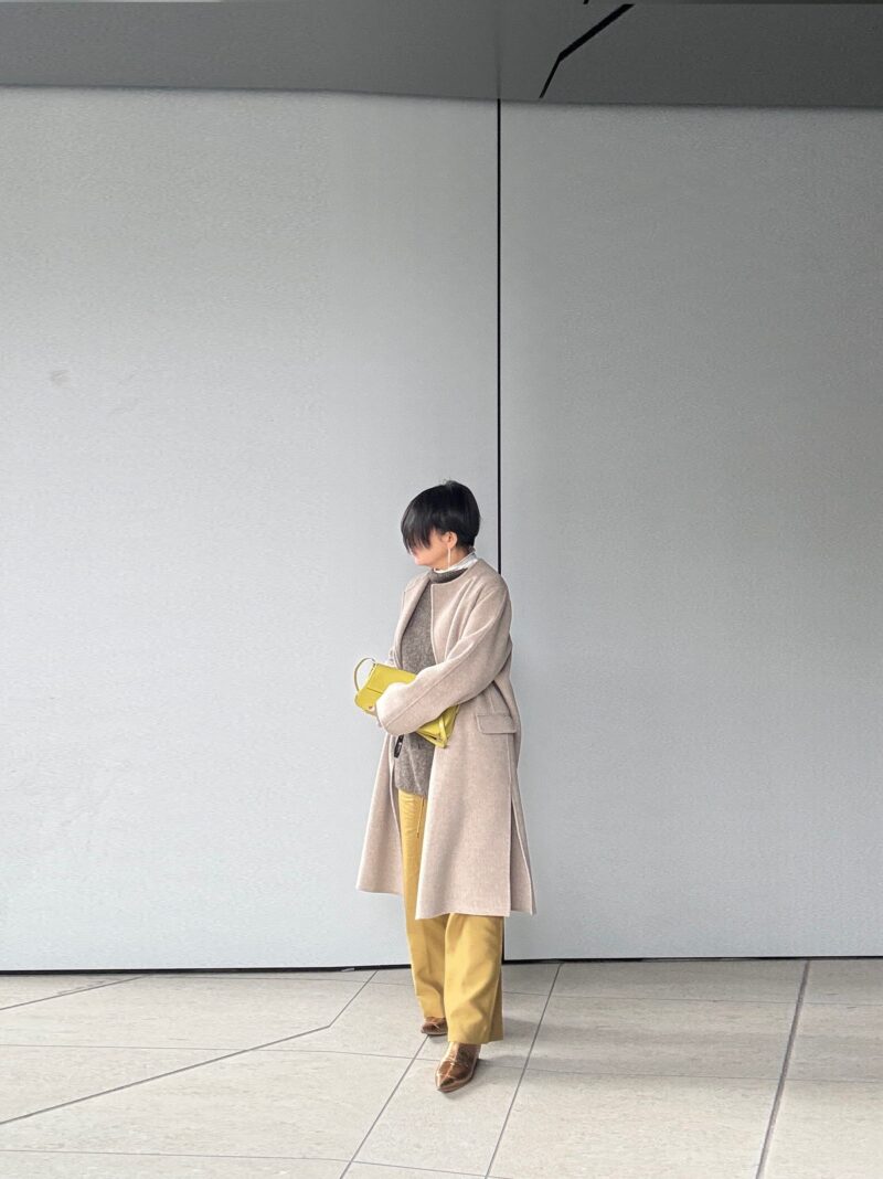 コートの中はカーキ色系のモヘアニット。イエローグリーンってカーキ色やオリーブグリーンとも合わせやすい。