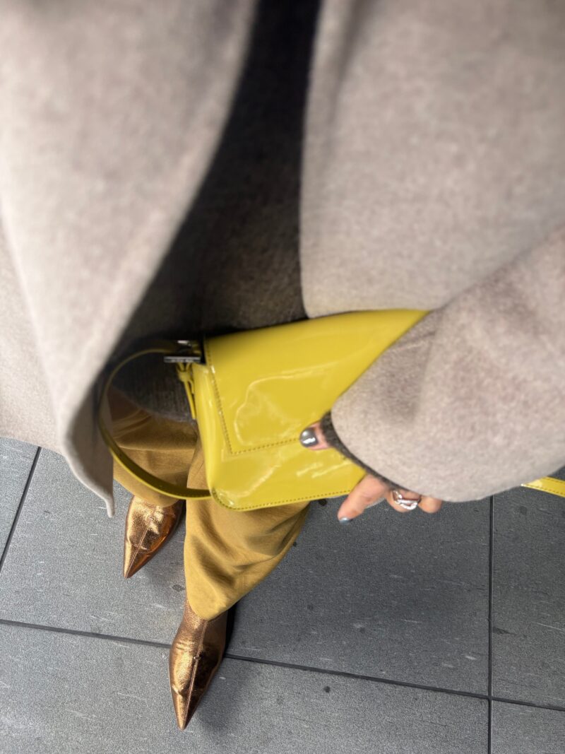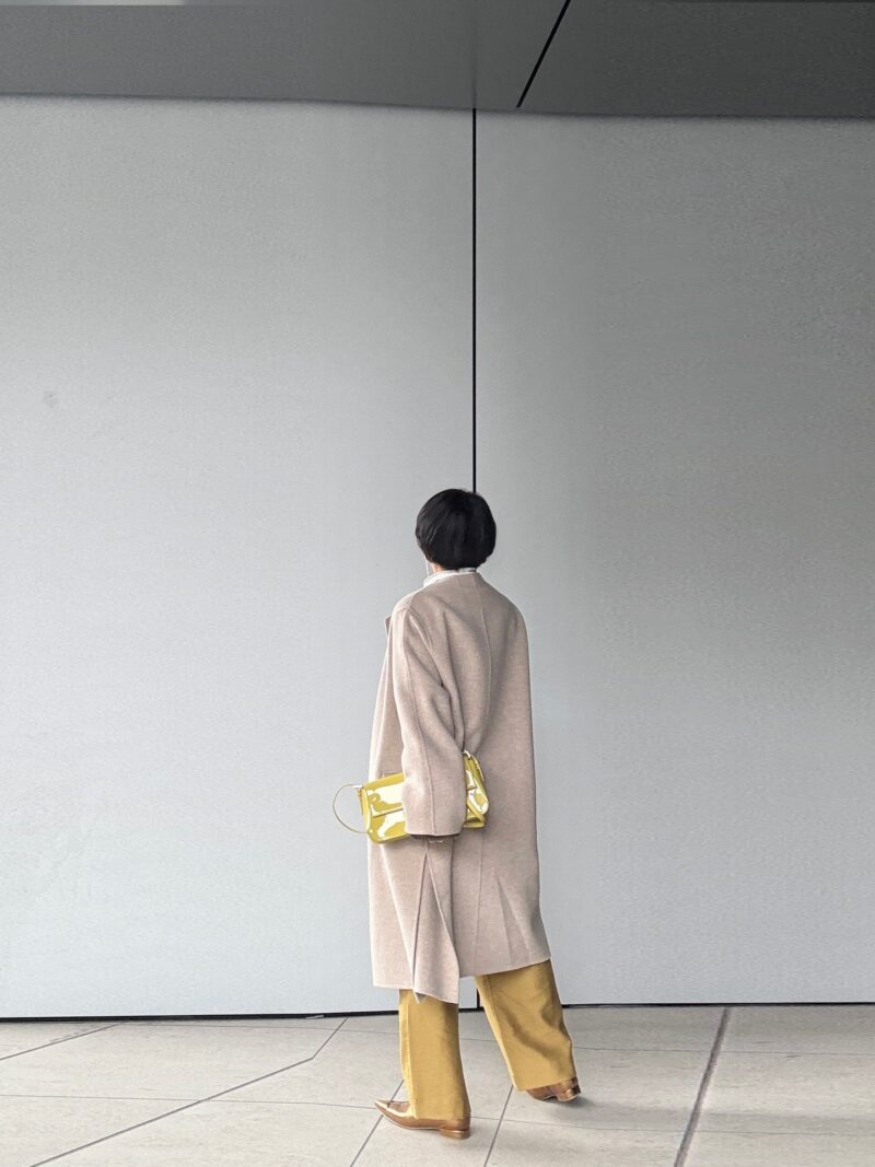 コート着るとバッグとパンツの色リンクが際立った。そして金色のGOLDブーツ、やっぱりどーーーーってことない!
