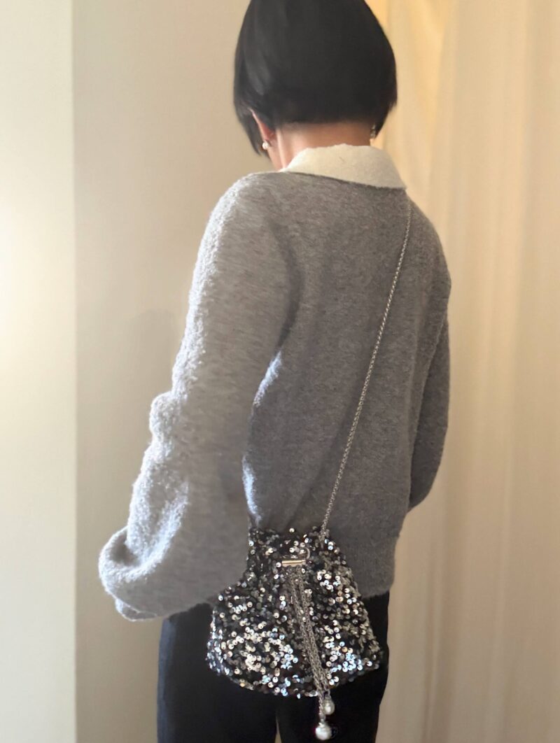 プクプク素材がきもちいいポロニットを着ただけのTOPS。ちょい何かを足したくなり、スパンコールの輝きがまぶしいミニポシェットbagをON!