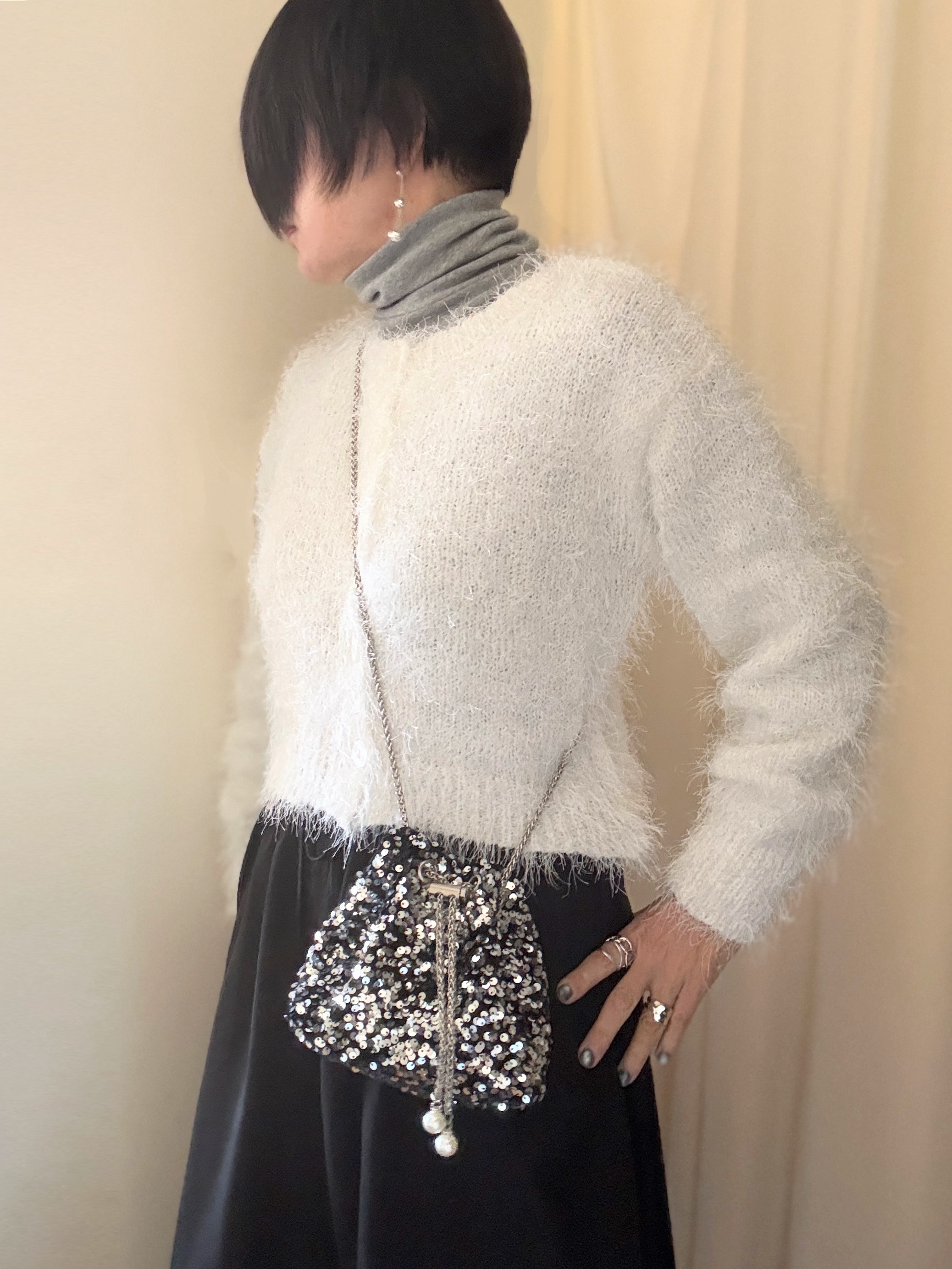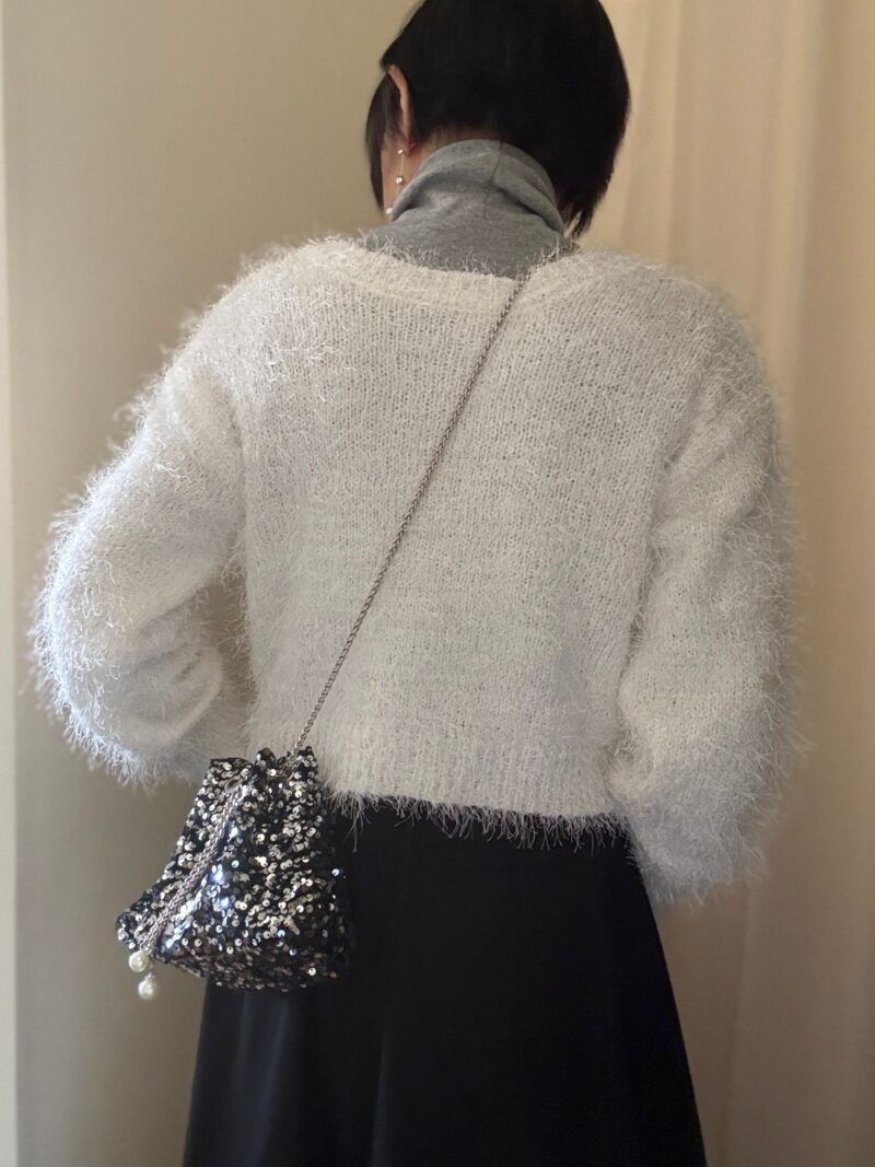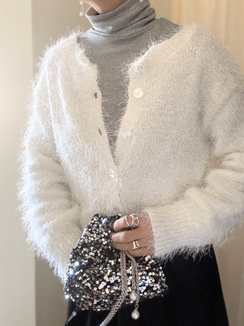 ・白のシャギーニットカーディガン:bonjoursaganボンジュールサガン