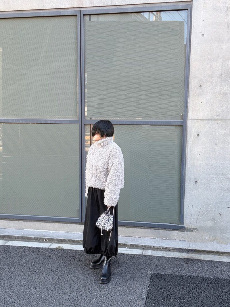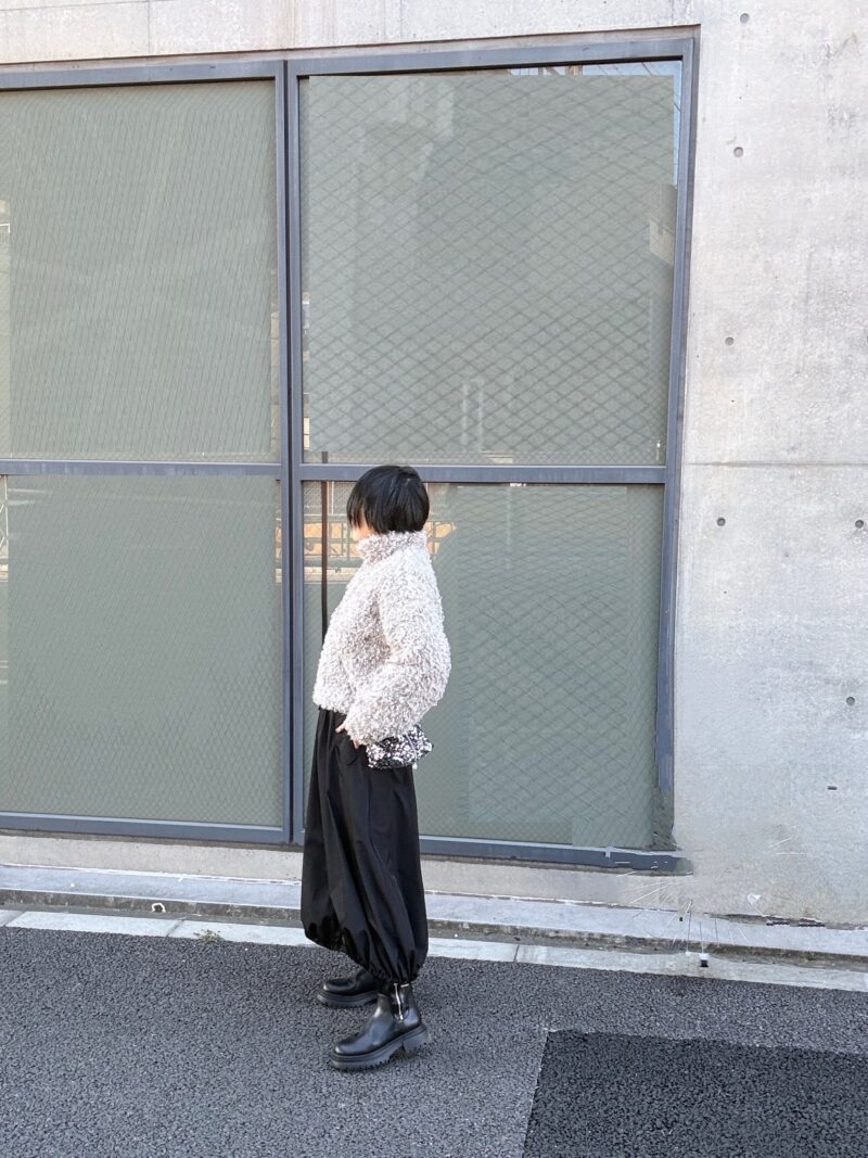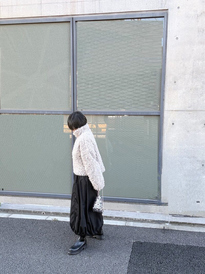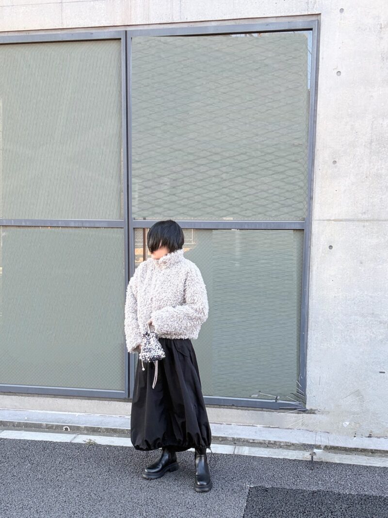 スカートは裾をドロストで絞れるバルーンシルエット。ポッテリブーツでカジュアル寄り。