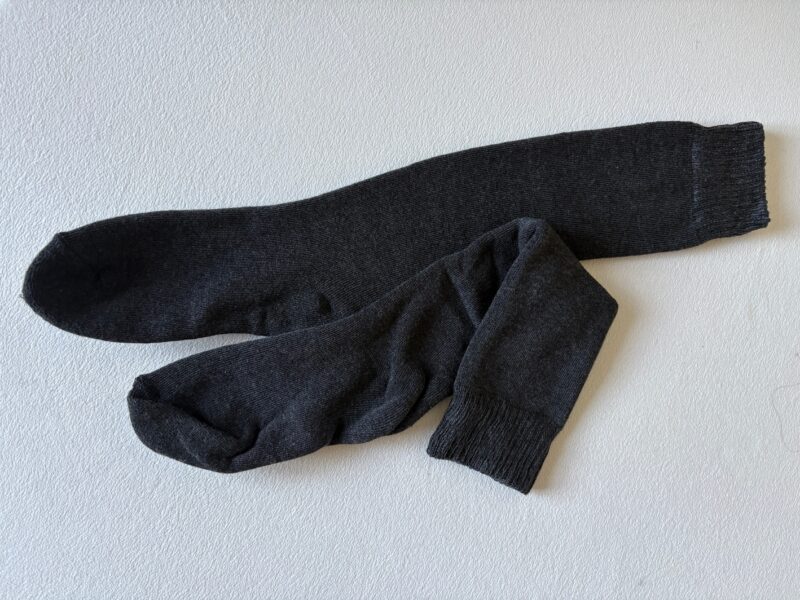 ブーツって同じサイズ買っても、フラットシューズやパンプスよりも一回り大きく作られていることが多く、靴の中で足が泳ぎがち・・・。そこで、ソックスを履いて厚みを調整する方法は地球上の全人類がやっている事だと思うのだが、これが短いソックスだとダメなのよ。ずりずりと脱げてくる。さらにあしの脛(スネ)にブーツの端やベロが当たって痛かったりするものも多い。そこで登場するのが厚地のハイソックスなのである。