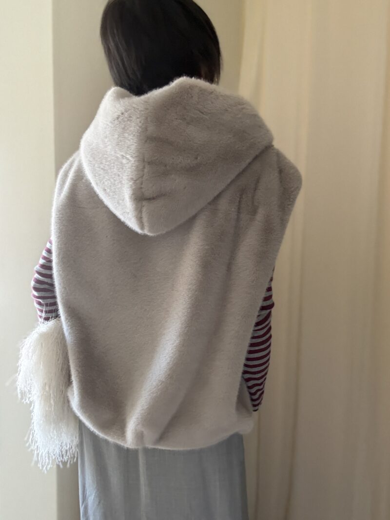 ・エコファーのフード付きジレ:【クリアランス★35%OFFクーポン使える!2/3迄】【MIA/ミア】ファーフードベスト/
