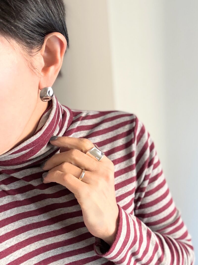 グレー×ボルドー色のボーダー。これ、新鮮!このやわらかタートルネックカットソーを軸にコーデを組んだ。(この色の組み合わせ、メッチャ私に刺さった・・・・何故かこの色で着るととてもテンションup。)