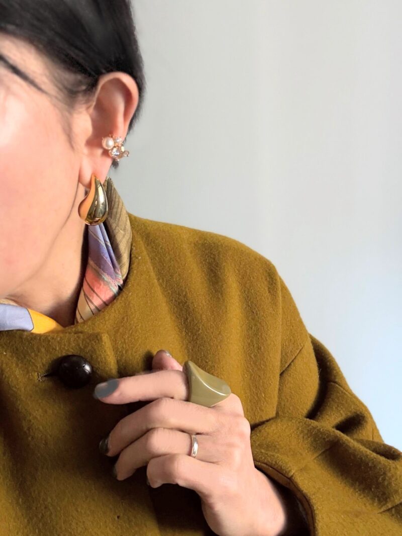 アクセサリー。GOLDで。イヤーカフも盛る。ネックレスが無い分 耳に盛る。