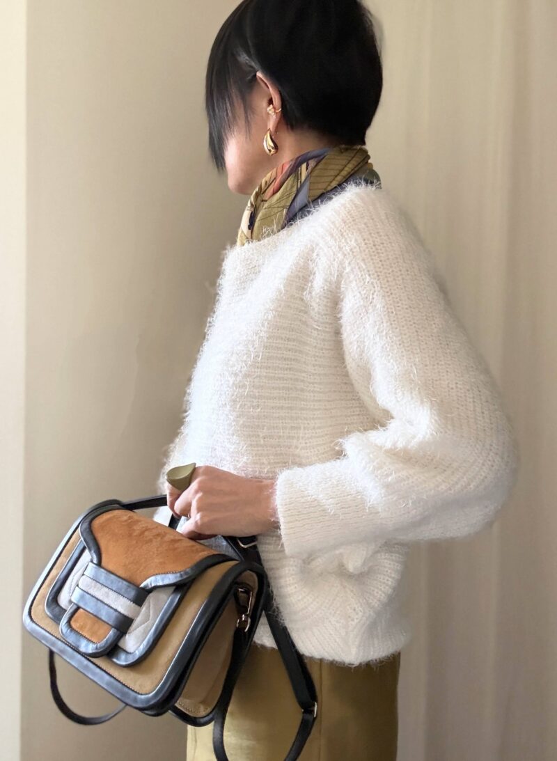 TOPSは素直に白のモヘアニットで。襟ぐり開いていて寒いのでHermesのスカーフで埋めた。このスカーフにもピスタチオグリーンのような辛子色が入っているのでここでも色リンク!