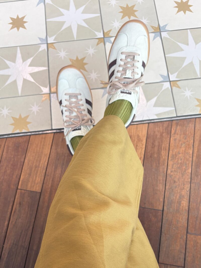 足元。これも色がバッチリ合うのでadidasのガゼル。色リンクさせることに集中。靴下も黄緑。この靴下はハイソックスなの。ハイソックスはズレなくて本当に便利。