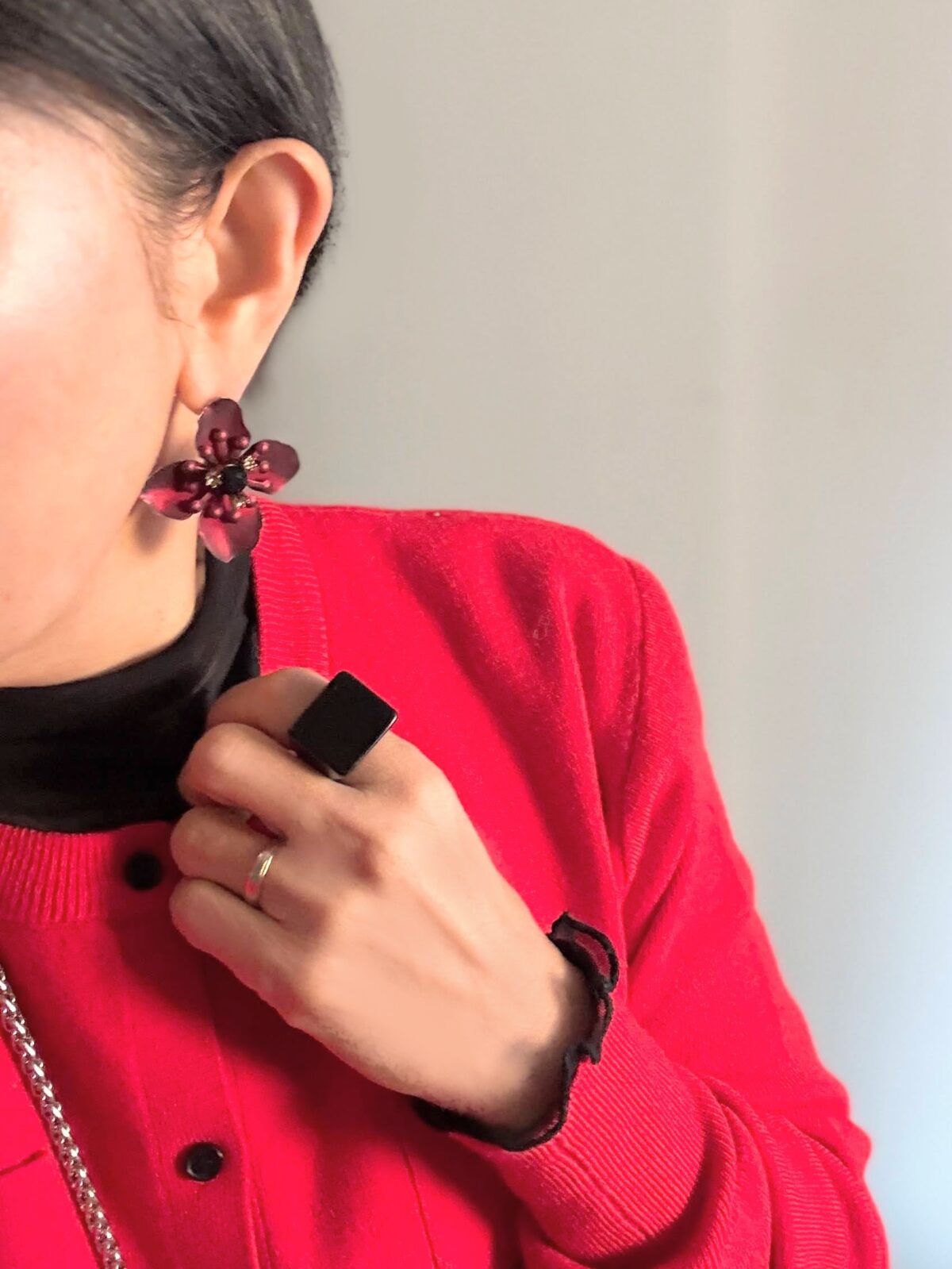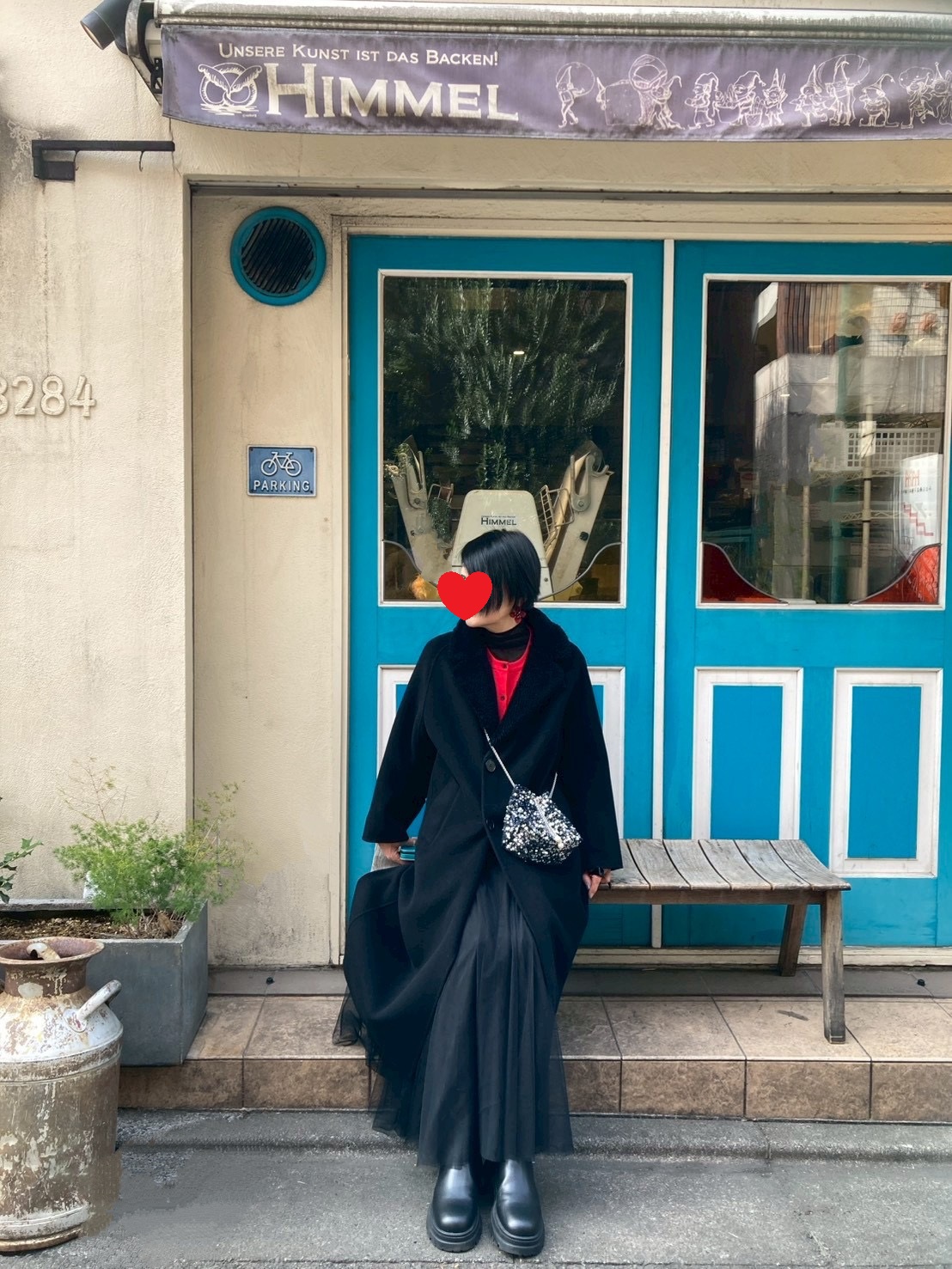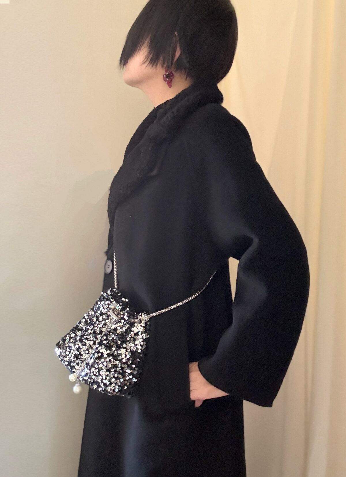 黒いコートってベタっとして暗くなるのでキラキラのスパンコールbagで光を添加。襟元に見える赤いニットがアクセントになるのでマフラーなしで。
