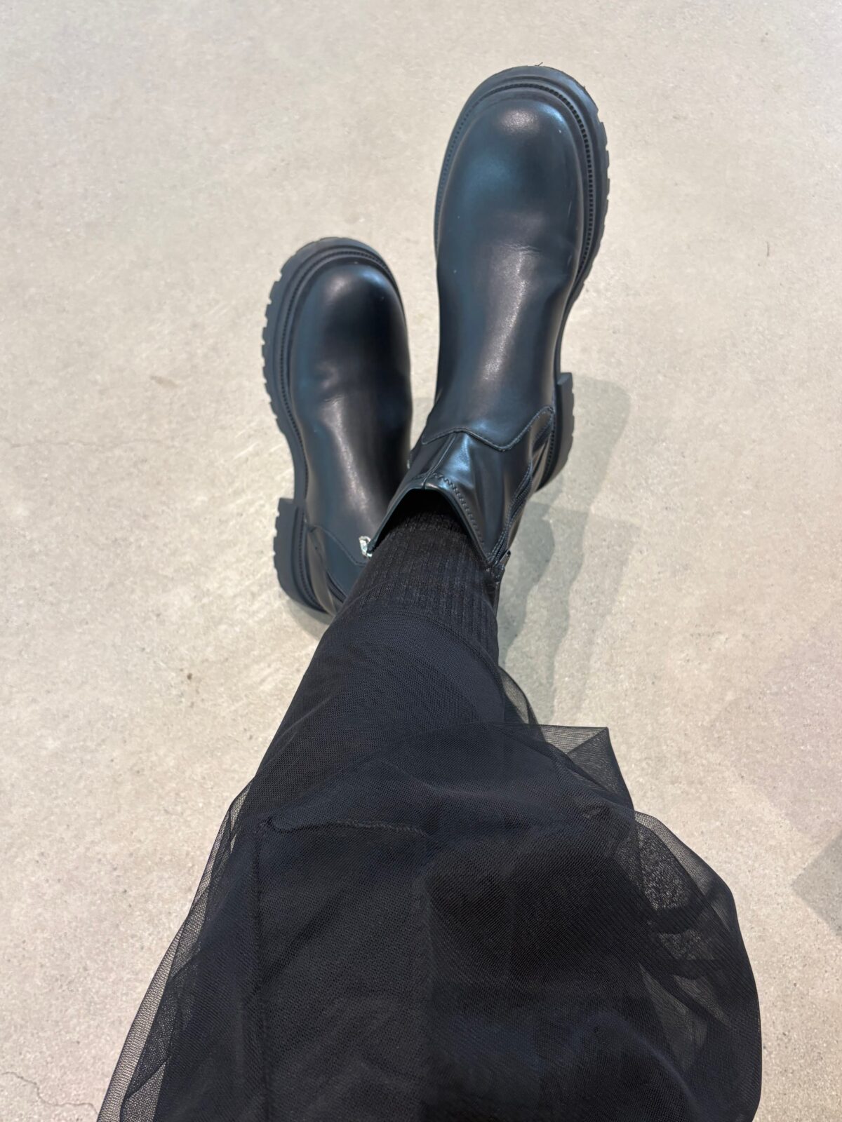 気分を上げる効果大のチュールスカート。ポッテリとしたブーツが相性良し。