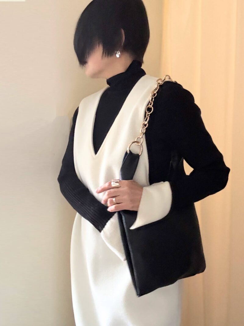 白黒コーデ。HAYNIさんのこのカッコイイ~本革×チェーンのbagを持ちたくて。黒スタートからコーデを組んだ。