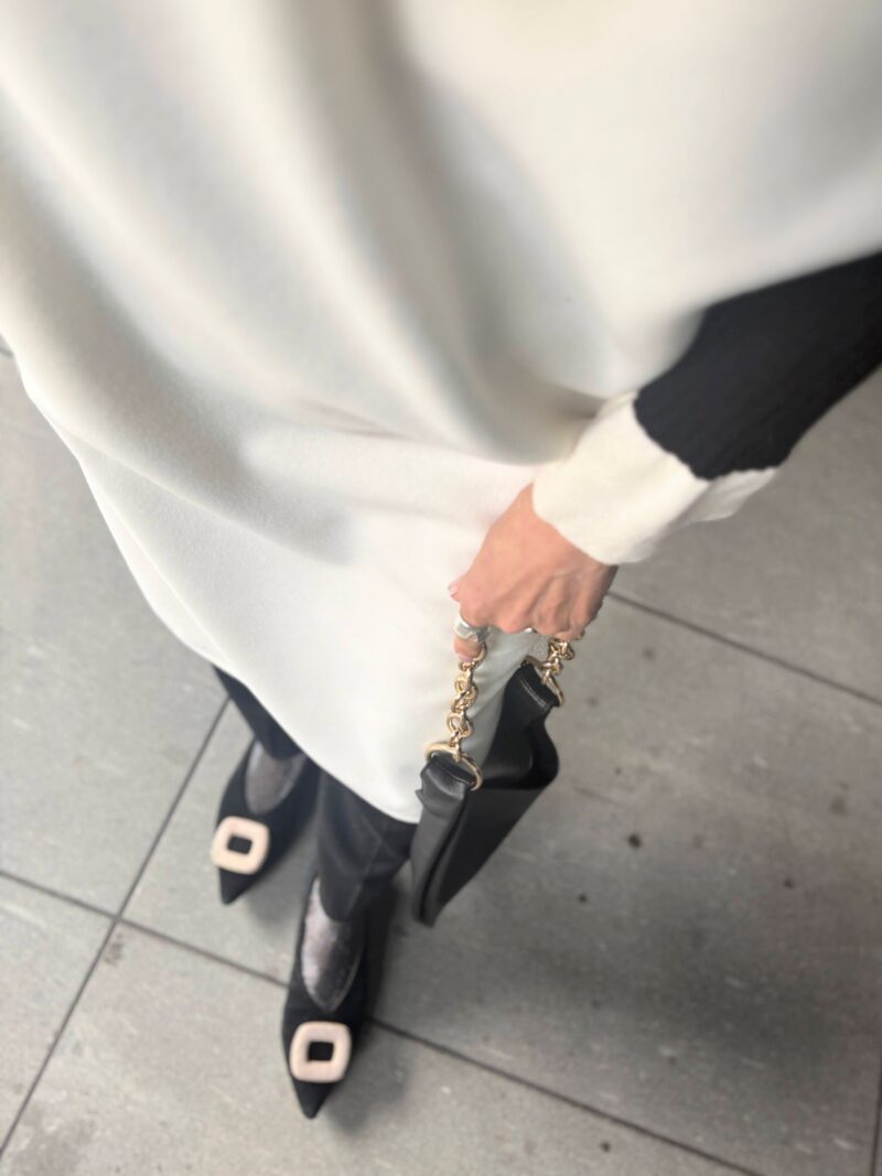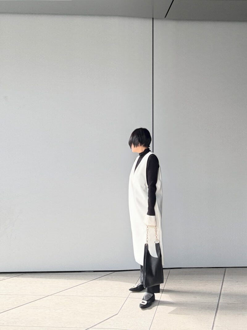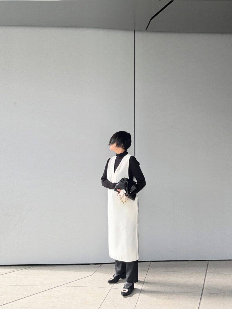 黒×白の配色リブニットの上から白の袖なしワンピ(ジャンパースカート)着るとなると下に何を履くか?悩む。