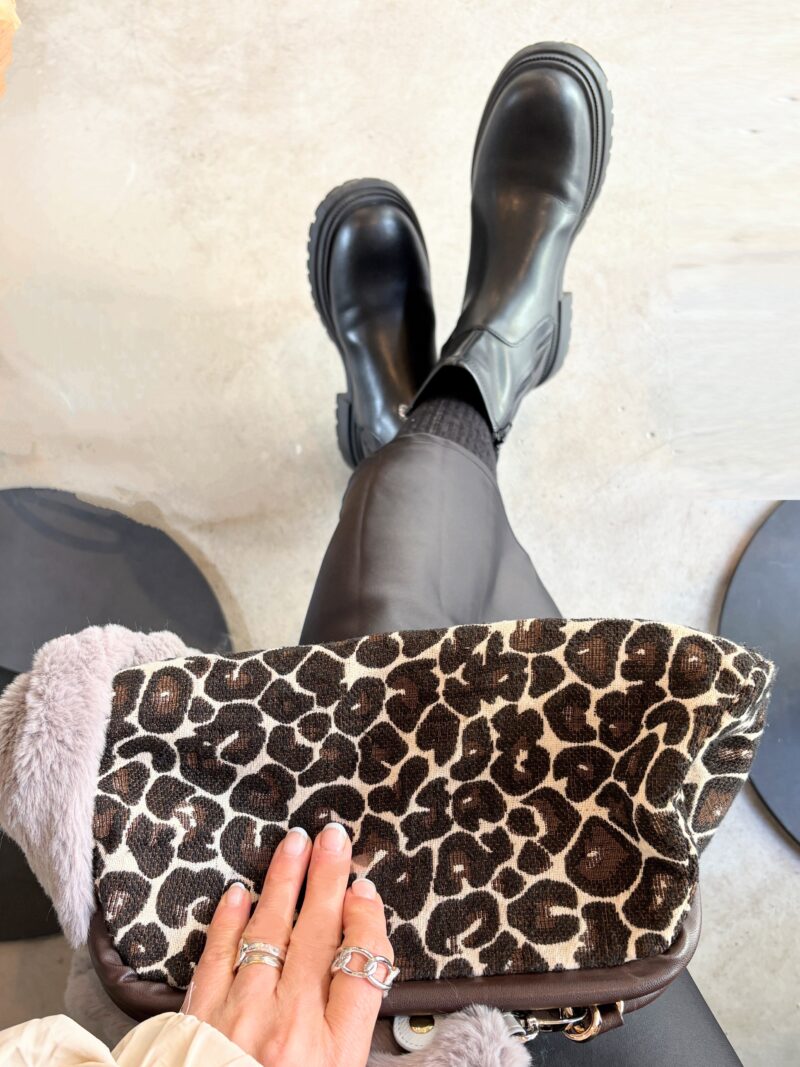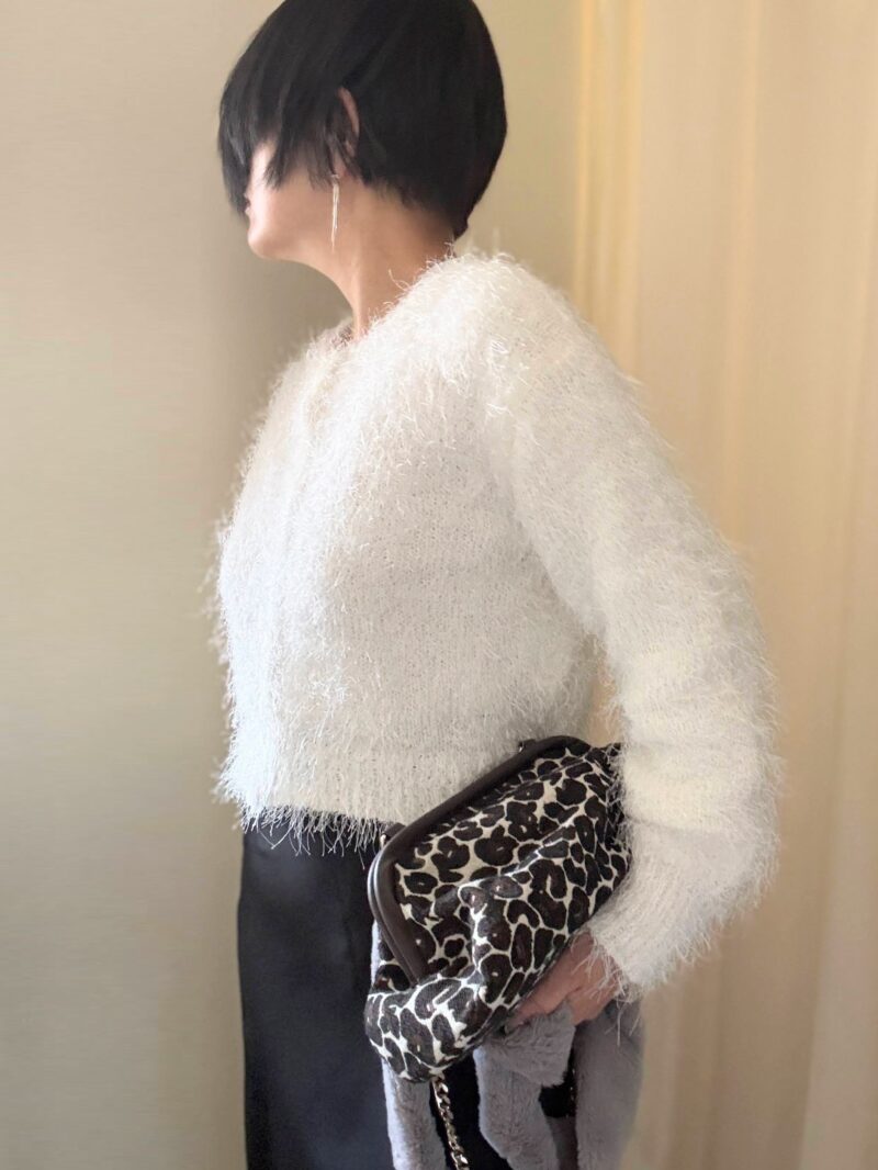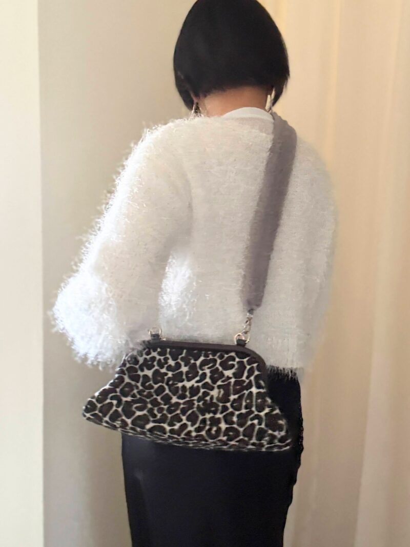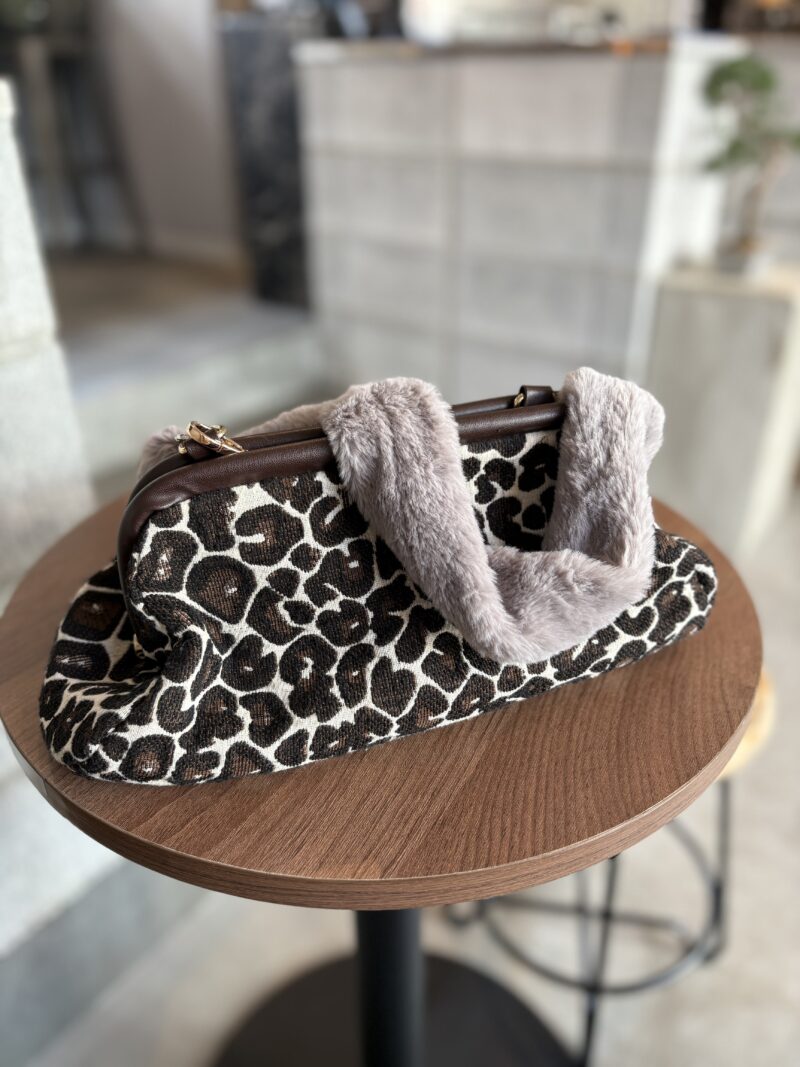 このジャガード織のヒョウ柄のクラッチハンドバッグ、チェーンが短くて「斜め掛けしたいのに出来ない・・・」というのが欠点だったのだが、先日手に入れたファーのストラップを取り付けて無事斜め掛けにチェンジ!
