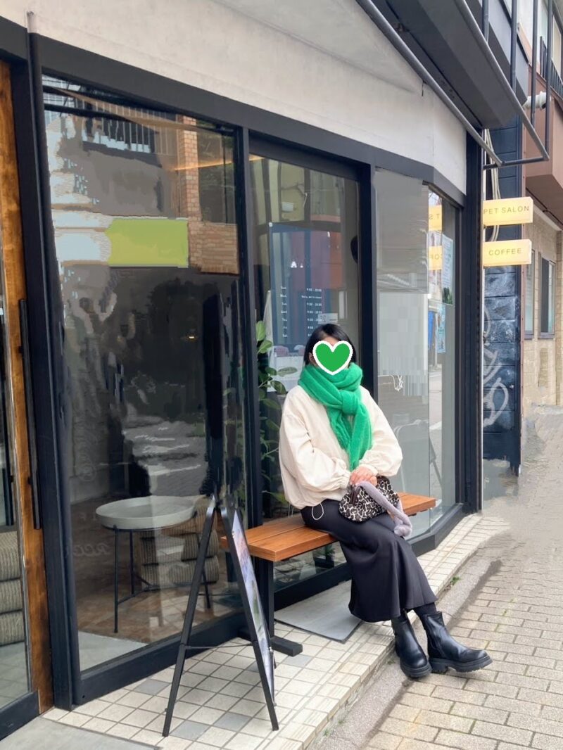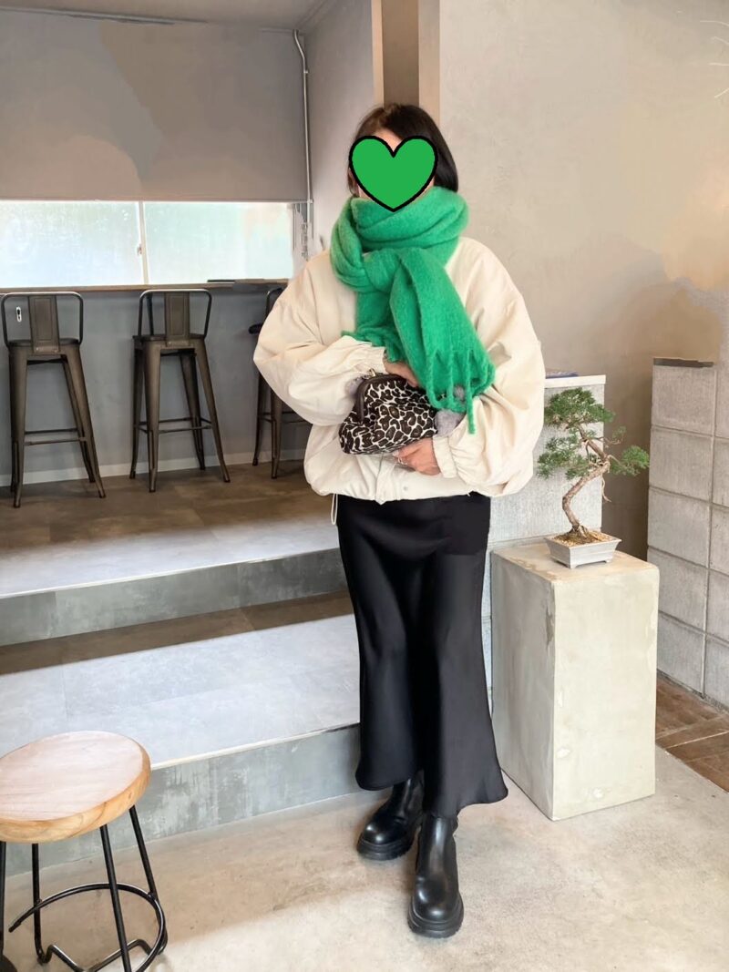 全体。淡いアイボリーのブルゾンはどんな服にも合わせやすいですね。ちょっと色が欲しくなったので鮮やかグリーンのボリューミーマフラーで。