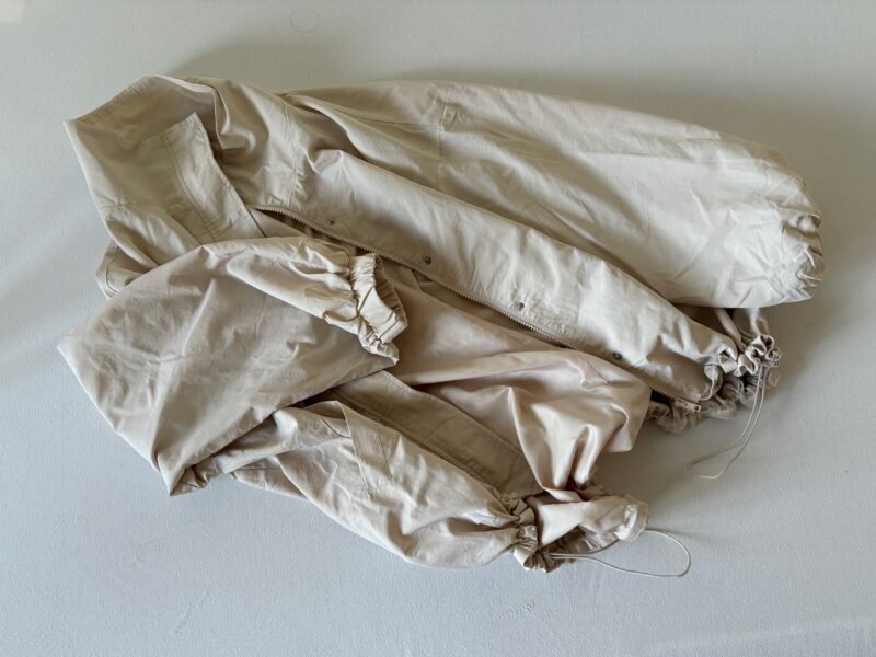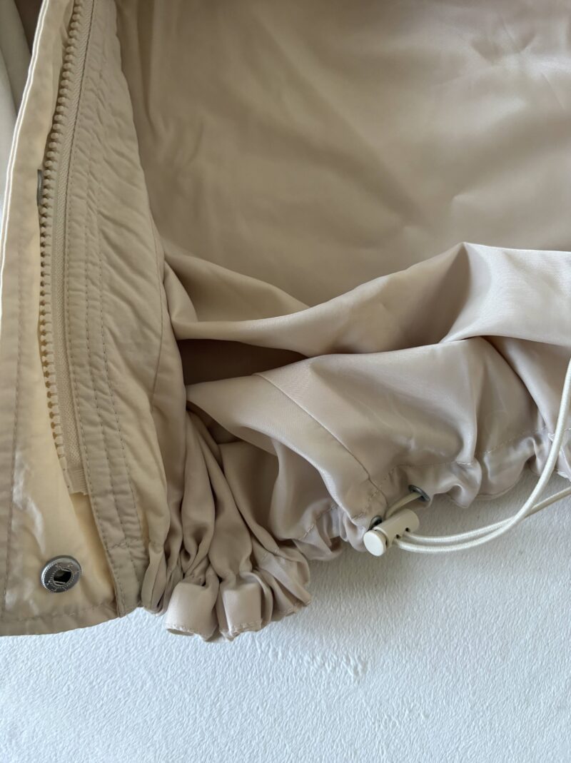 裾のコードが絞り具合でシルエットが変わるのが便利。かなりギュッと絞るとたわんでウエスト下ぐらいにブラウジングできる。