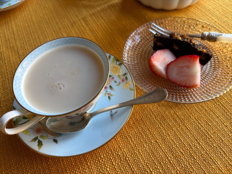 ミルクティーの方がこのカップには合いそう、と思って豆乳でミルクティに。