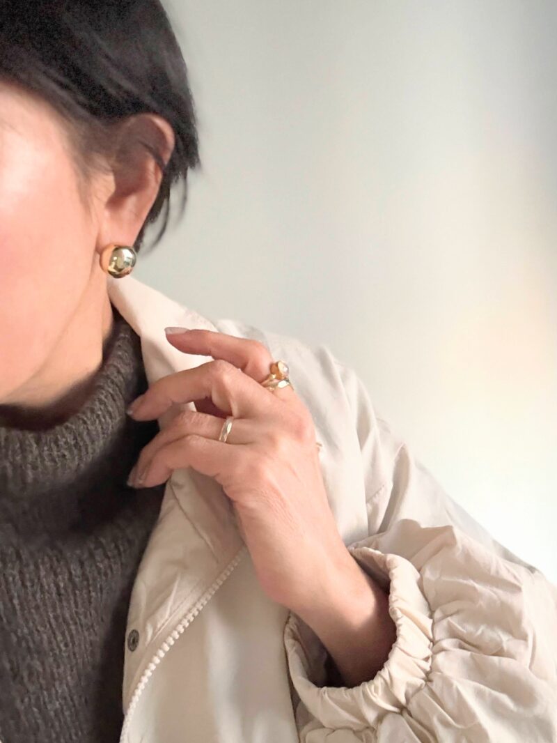 狙い通り! このシンプルな半球のGOLDピアス、どんなコーデにも合う。マフラーやタートルネックにも引っかからない。