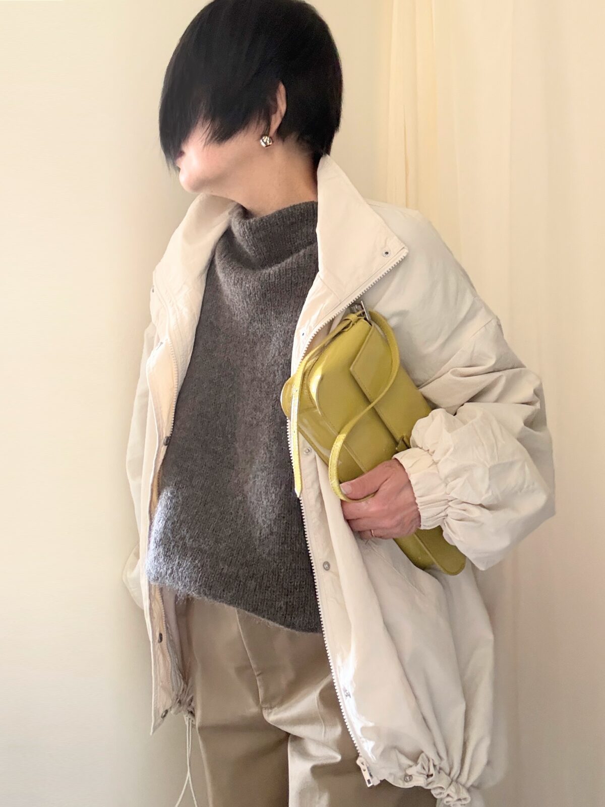 このブルゾン、この超ビッグなニットの上からでも問題なくサクッと羽織れる。窮屈な感じにならず、こなれ感。