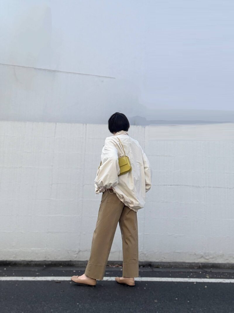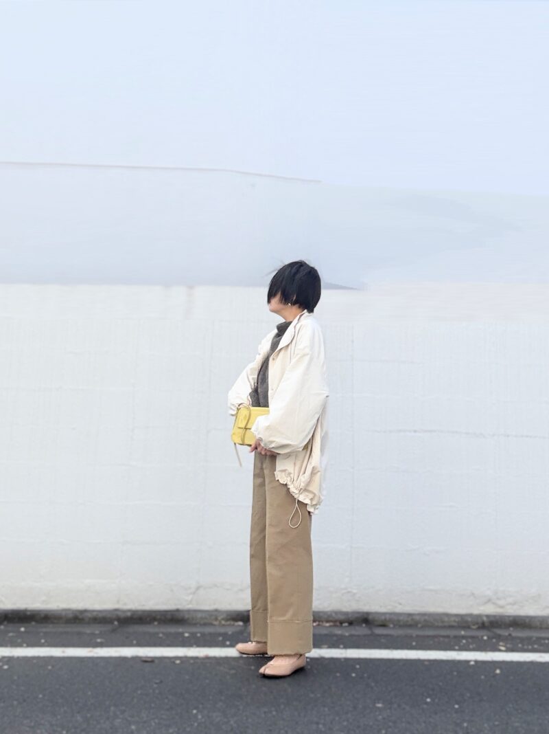 とてもポカポカ暖かった日。ニット+チノパンというカジュアルなラフコーデに軽いブルゾンを羽織るだけでOK。