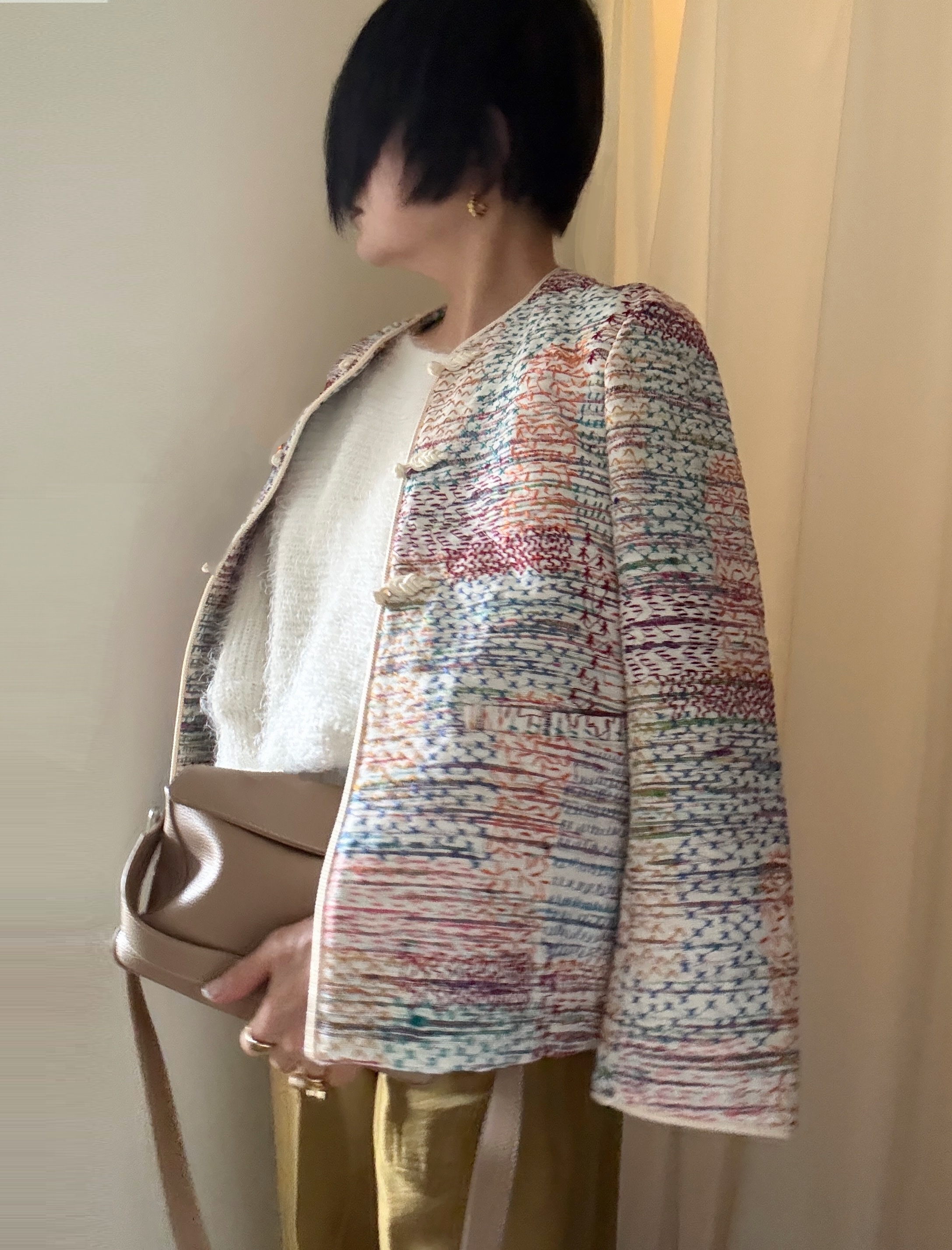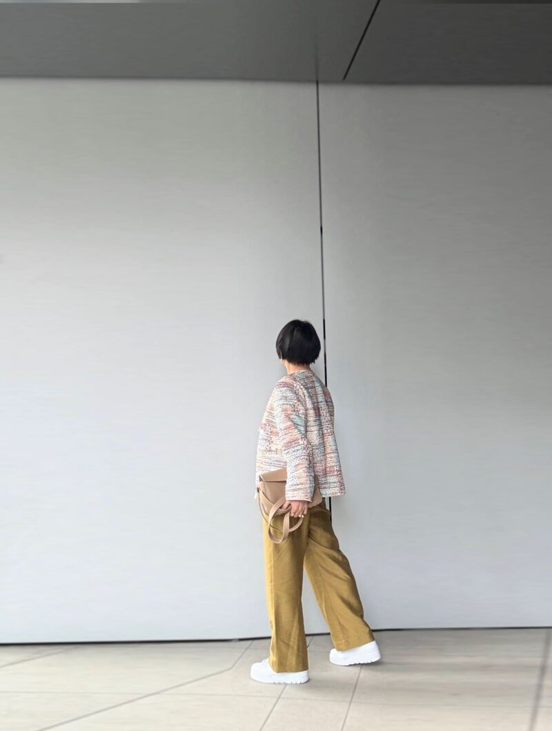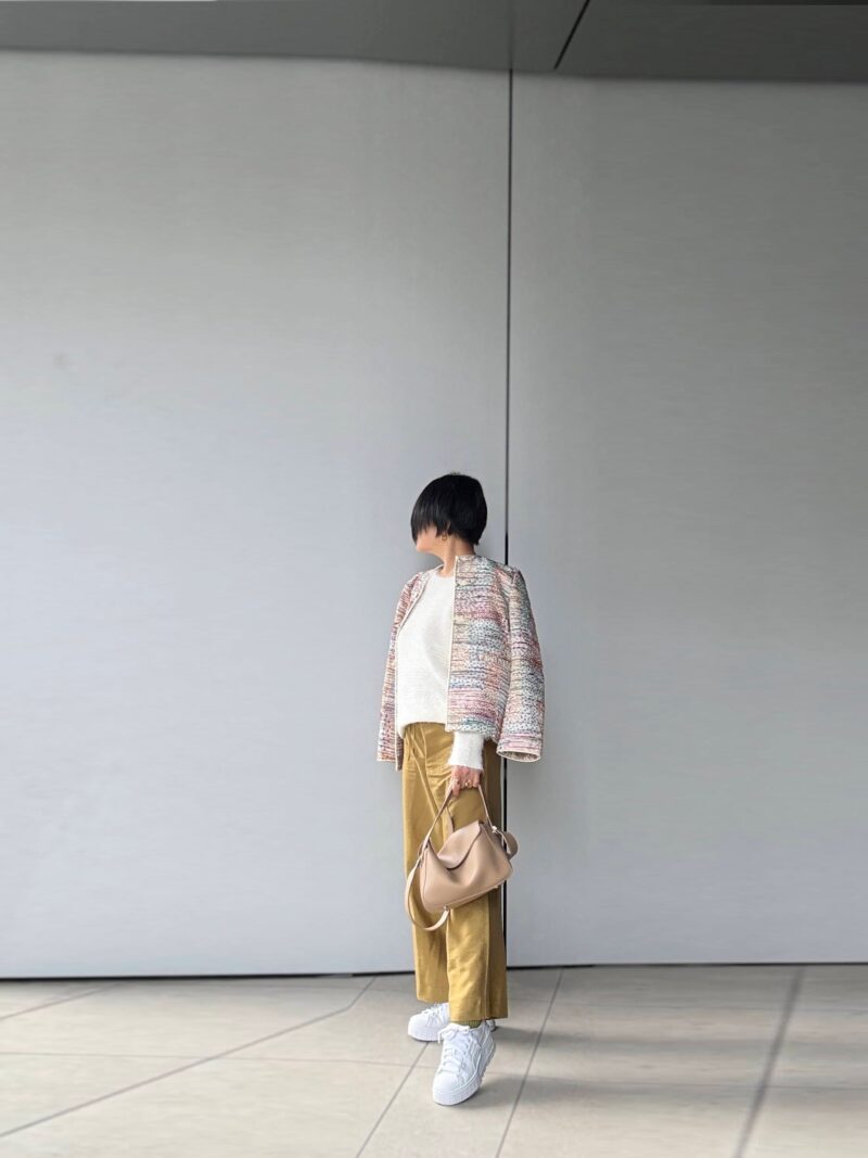 このジャケット、色がMIXされているのでどんな色のアイテムでも合う。よく見ると光ってる辛子色も混じっていたので今年買ったこのパンツを合わせてみた次第。
