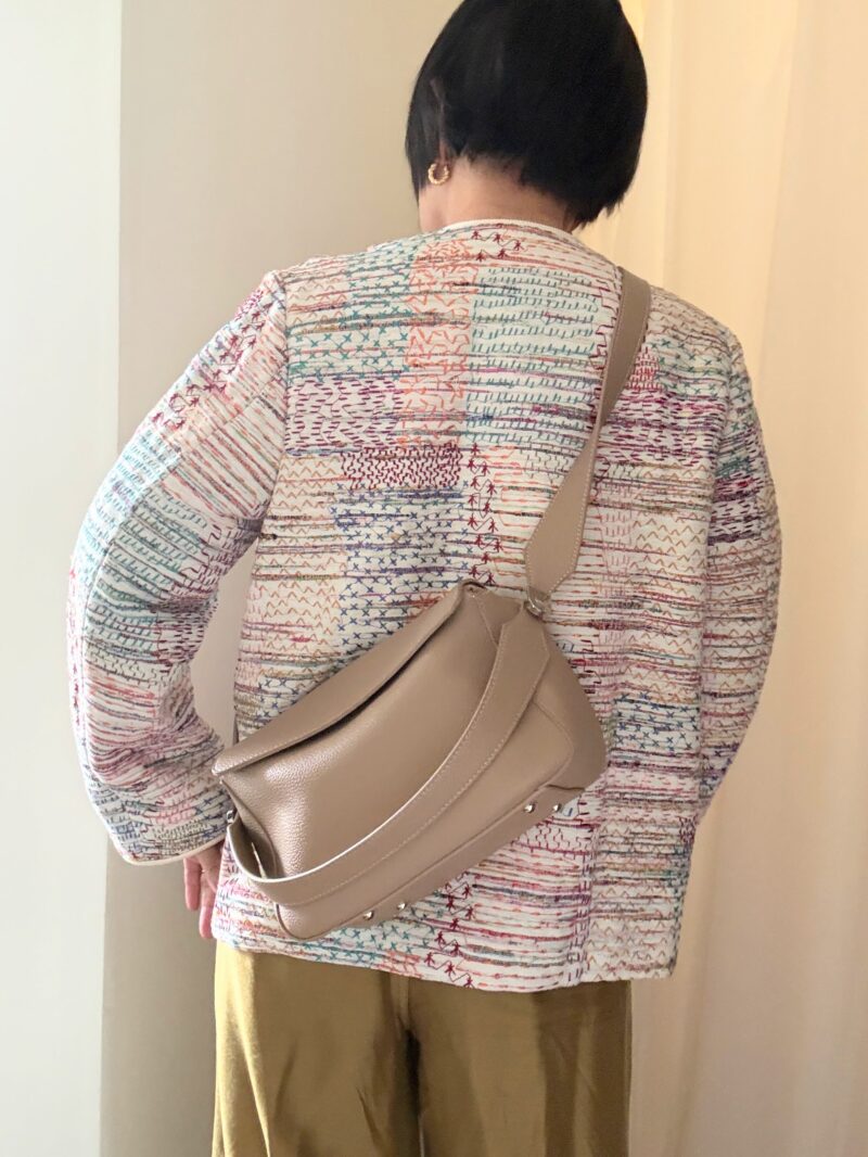 ベージュのバッグは3WAY。肩かけや斜め掛けでもいいし、