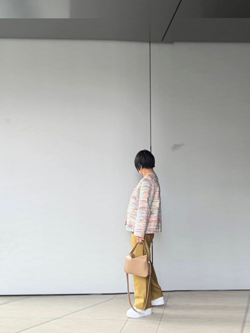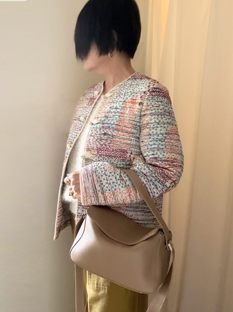 今日のコーデ、バッグの色に悩んだ。白かな?と思ったんだけどこのきれいな色MIXのジャケットに浮きすぎたのでベージュで。」ZAKKABOXさんのこのバッグはとにかく軽くていろいろな持ち方が出来てヘビロテ中。