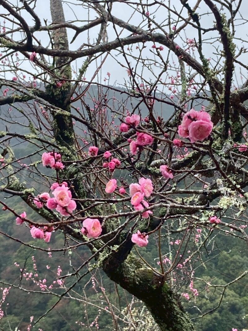 山の斜面にびっしりとピンクと白の梅が。